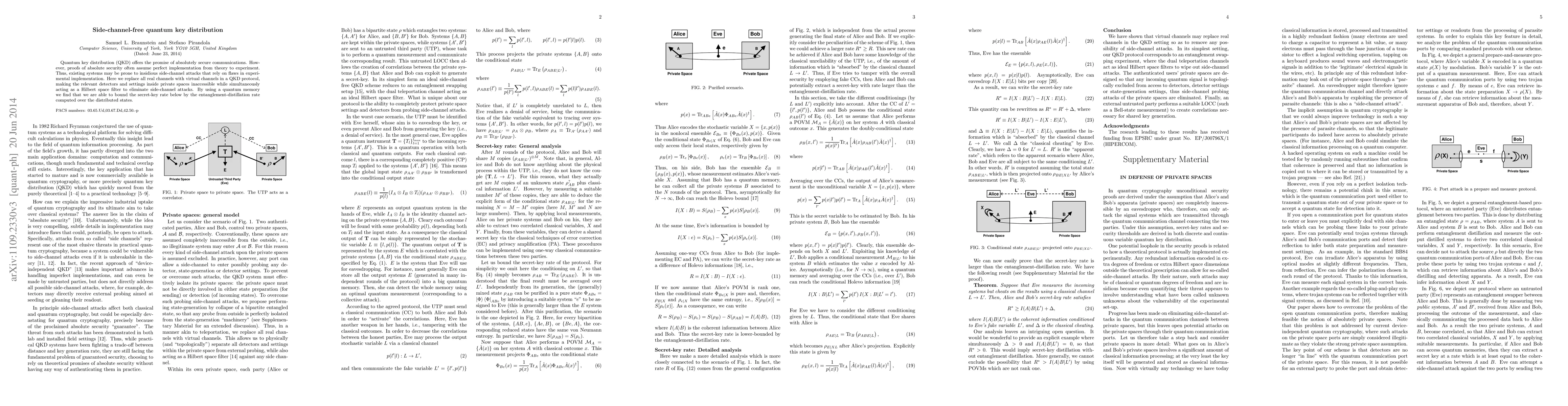 Quantum key distribution (QKD) offers the promise of absolutely secure communications. However, proofs of absolute security often assume perfect implementation from theory to experiment. Thus, existing systems may be prone to insidious side-channel attacks that rely on flaws in experimental implementation. Here we replace all real channels with virtual channels in a QKD protocol, making the relevant detectors and settings inside private spaces inaccessible while simultaneously acting as a Hilbert space filter to eliminate side-channel attacks. By using a quantum memory we find that we are able to bound the secret-key rate below by the entanglement-distillation rate computed over the distributed states.
