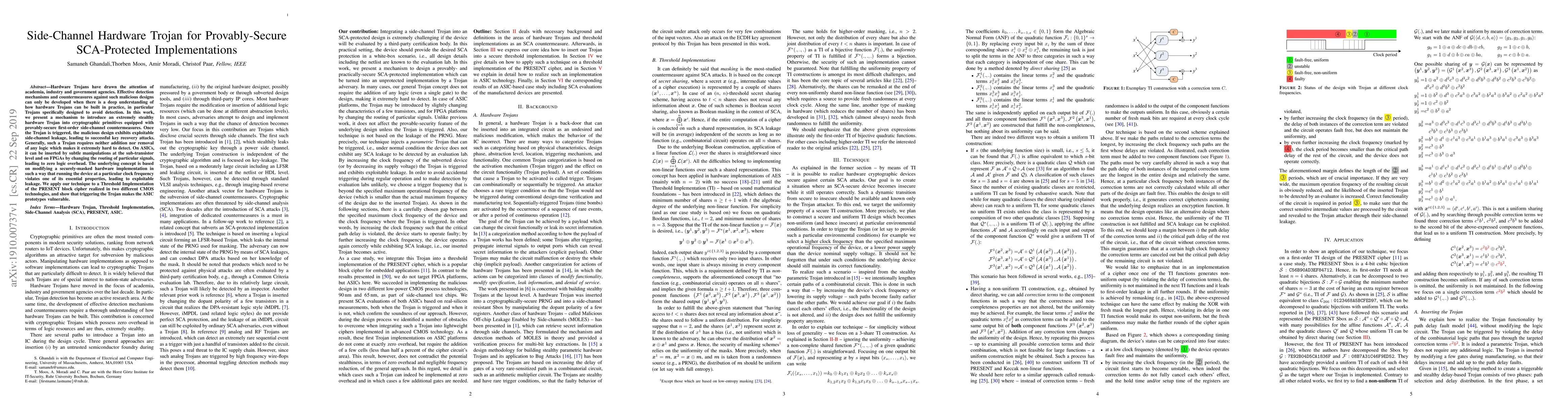 This paper presents a stealthy hardware Trojan designed to exploit side-channel vulnerabilities in cryptographic implementations that have first-order countermeasures. The Trojan, requiring no logic changes, can be inserted at the sub-transistor level or by signal routing changes, leading to zero logic overhead and making it difficult to detect.