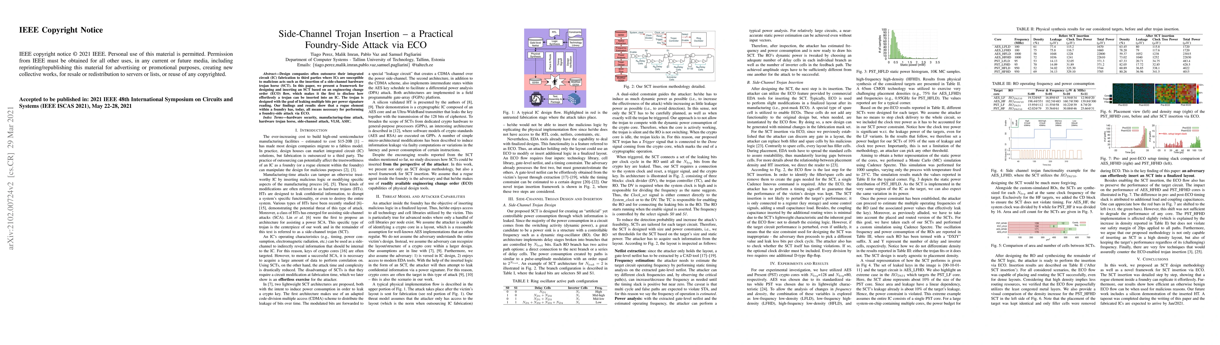 This paper introduces a framework for inserting a side-channel hardware trojan via an engineering change order (ECO) during IC fabrication, demonstrating the ease with which such attacks can be executed by a foundry. The study reveals that a rogue foundry can effortlessly implement a trojan designed to leak multiple bits per power signature reading.