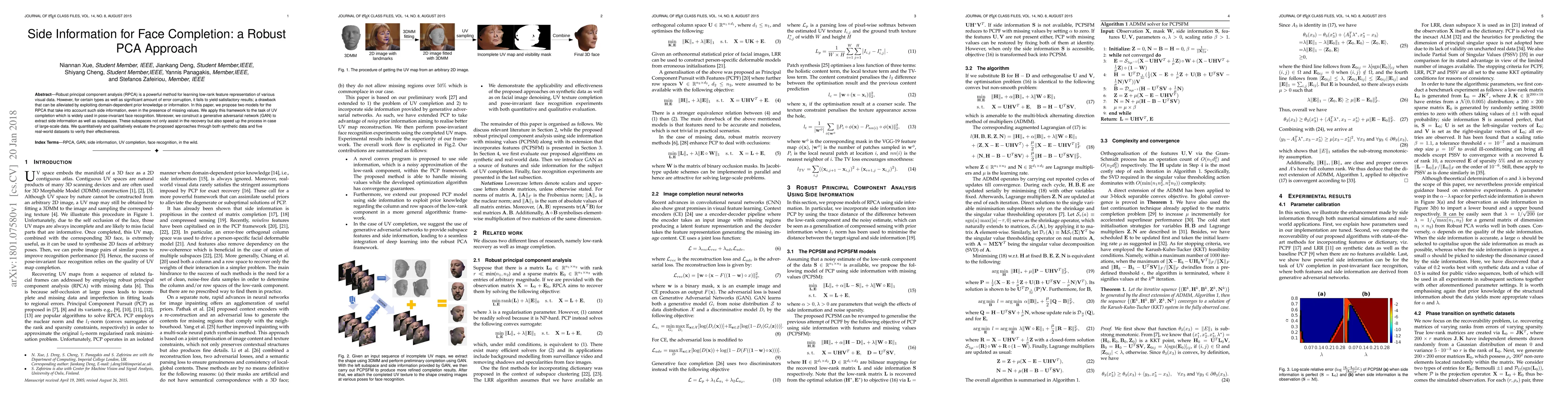 This paper proposes a new approach to face completion using robust PCA with side information, improving results on UV completion tasks and real-world datasets.