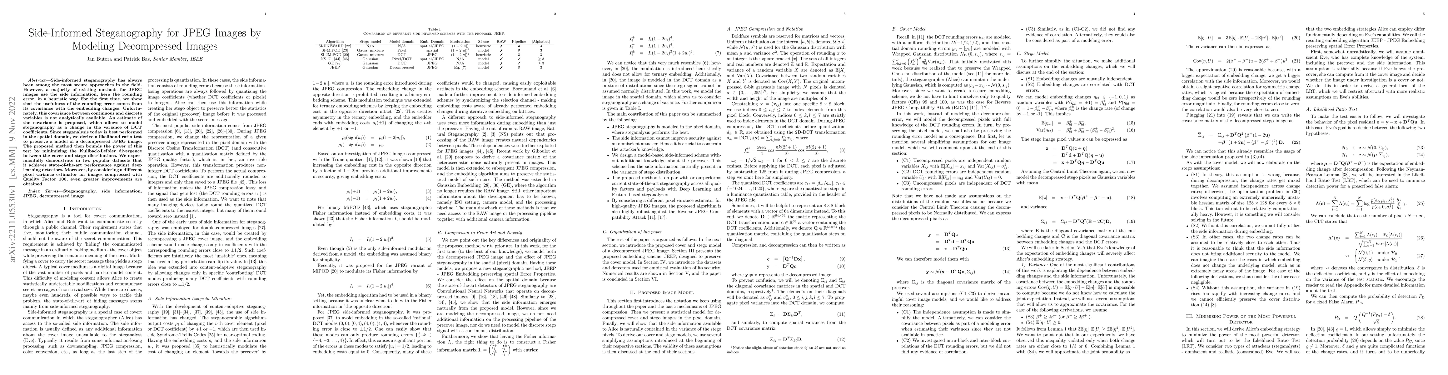 This paper proposes a novel side-informed steganography method for JPEG images by modeling the covariance between rounding error and embedding changes, achieving state-of-the-art performance against deep learning detectors while minimizing the Kullback-Leibler divergence. It also demonstrates significant improvements for images compressed at higher quality factors.