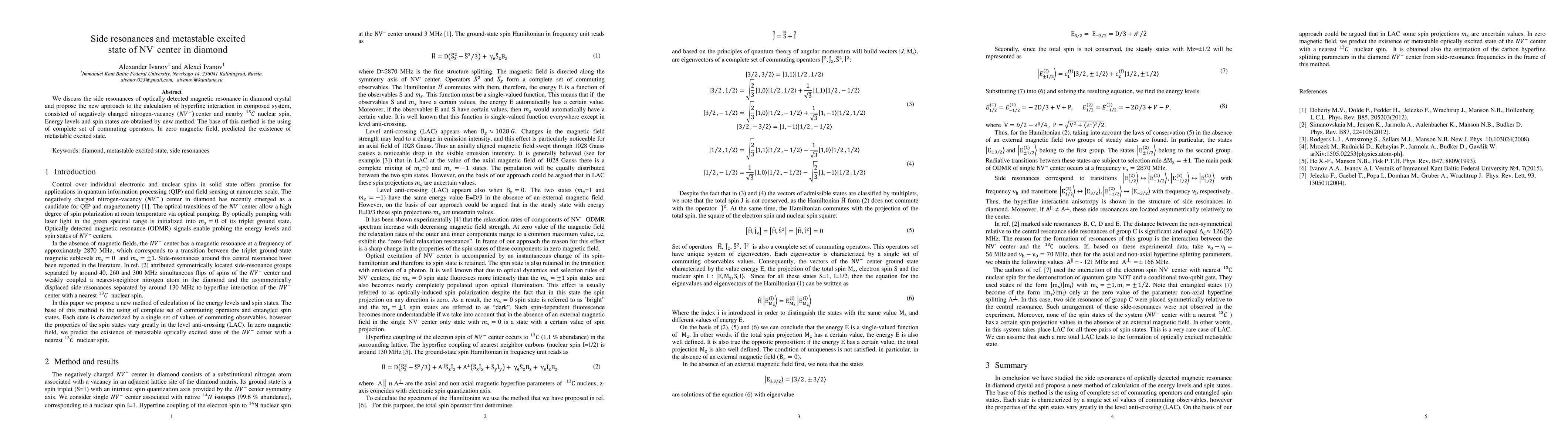 We discuss the side resonances of optically detected magnetic resonance in diamond crystal and propose the new approach to the calculation of hyperfine interaction in composed system, consisted of negatively charged nitrogen-vacancy NV- center and nearby 13C nuclear spin. Energy levels and spin states are obtained by new method. The base of this method is the using of complete set of commuting operators. In zero magnetic field, predicted the existence of metastable excited state.