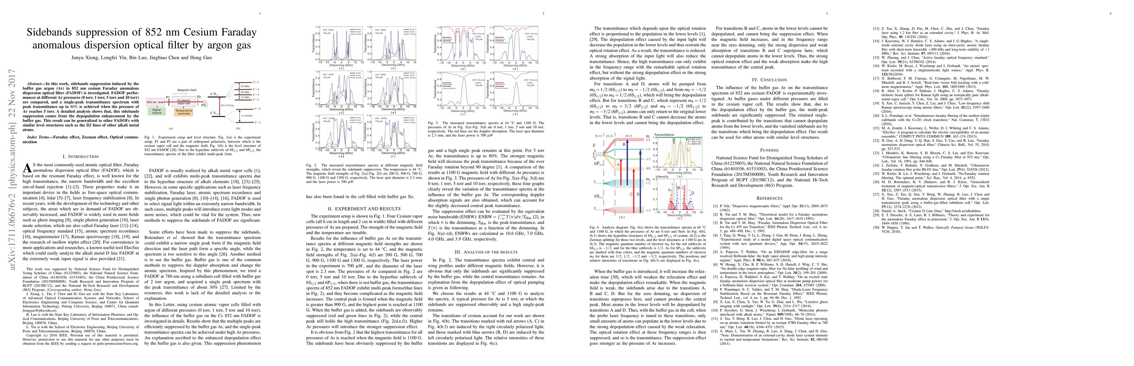 Researchers investigated the effect of argon gas on cesium Faraday anomalous dispersion optical filter performance at 852 nm, achieving a single-peak transmittance spectrum with up to 80% peak transmittance.