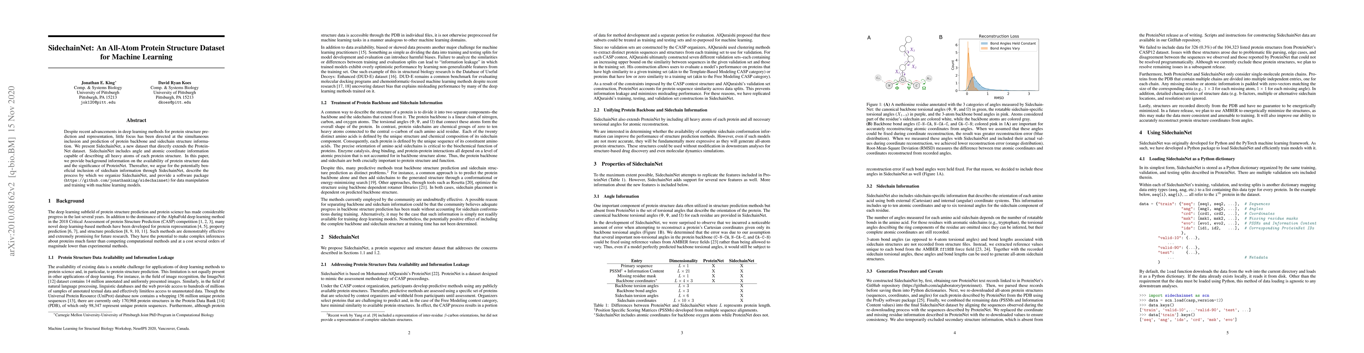SidechainNet is an all-atom protein structure dataset that extends ProteinNet, providing angle and atomic coordinate information for protein backbone and sidechains. The paper discusses the importance of including sidechain data for machine learning models and offers a software package for data manipulation and training.