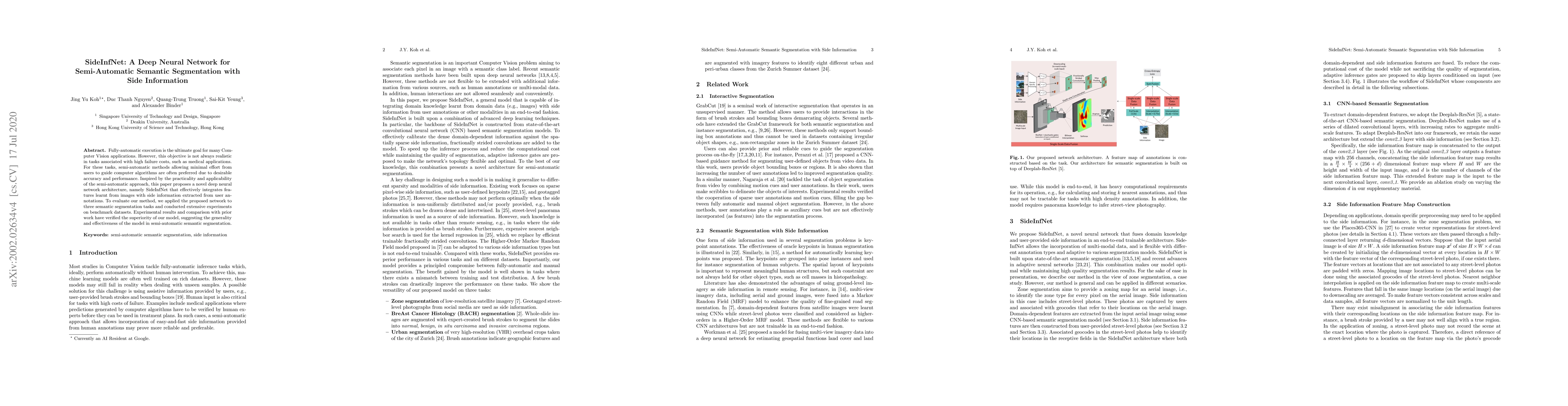 Fully-automatic execution is the ultimate goal for many Computer Vision applications. However, this objective is not always realistic in tasks associated with high failure costs, such as medical applications. For these tasks, semi-automatic methods allowing minimal effort from users to guide computer algorithms are often preferred due to desirable accuracy and performance. Inspired by the practicality and applicability of the semi-automatic approach, this paper proposes a novel deep neural network architecture, namely SideInfNet that effectively integrates features learnt from images with side information extracted from user annotations. To evaluate our method, we applied the proposed network to three semantic segmentation tasks and conducted extensive experiments on benchmark datasets. Experimental results and comparison with prior work have verified the superiority of our model, suggesting the generality and effectiveness of the model in semi-automatic semantic segmentation.