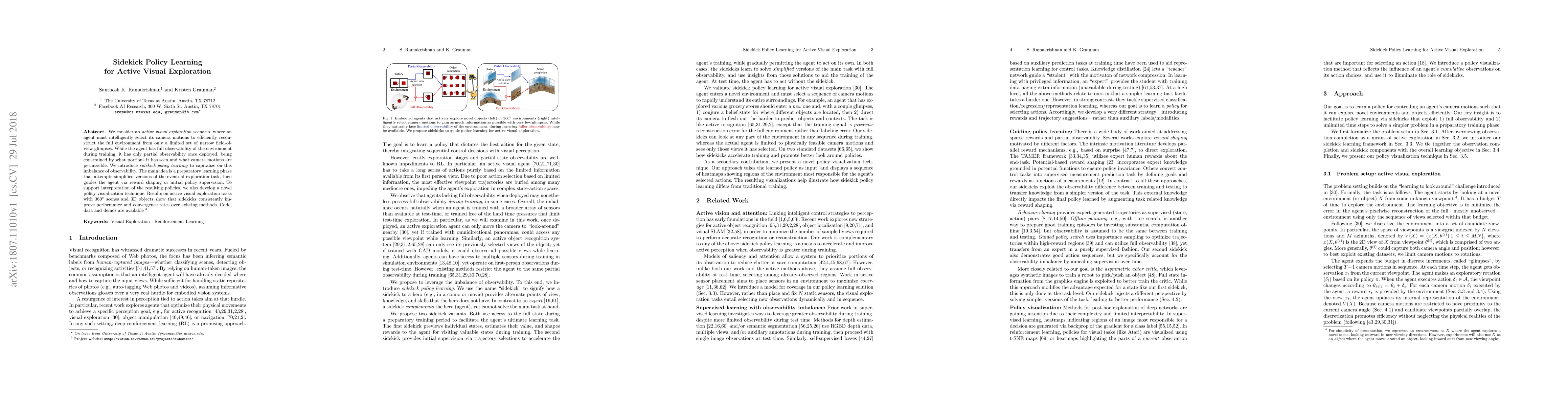 This paper proposes sidekick policy learning to enhance an agent's active visual exploration by reconstructing environments from limited glimpses. The method uses preparatory learning during training to guide the agent through partial observability in deployment, improving performance and convergence rates over existing methods.