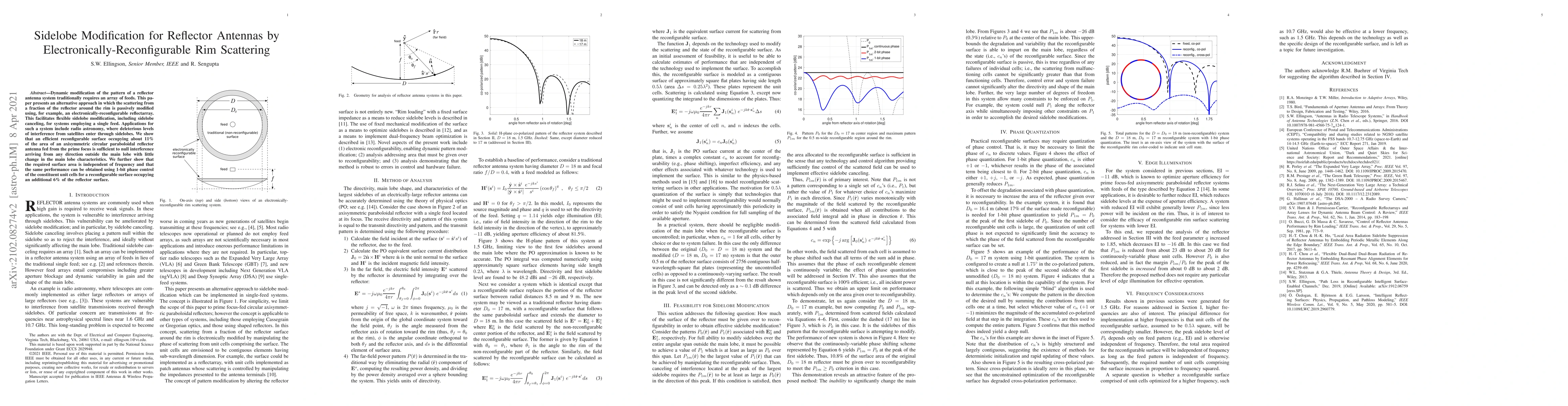 Dynamic modification of the pattern of a reflector antenna system traditionally requires an array of feeds. This paper presents an alternative approach in which the scattering from a fraction of the reflector around the rim is passively modified using, for example, an electronically-reconfigurable reflectarray. This facilitates flexible sidelobe modification, including sidelobe canceling, for systems employing a single feed. Applications for such a system include radio astronomy, where deleterious levels of interference from satellites enter through sidelobes. We show that an efficient reconfigurable surface occupying about 11% of the area of an axisymmetric circular paraboloidal reflector antenna fed from the prime focus is sufficient to null interference arriving from any direction outside the main lobe with little change in the main lobe characteristics. We further show that the required surface area is independent of frequency and that the same performance can be obtained using 1-bit phase control of the constituent unit cells for a reconfigurable surface occupying an additional 6% of the reflector surface.