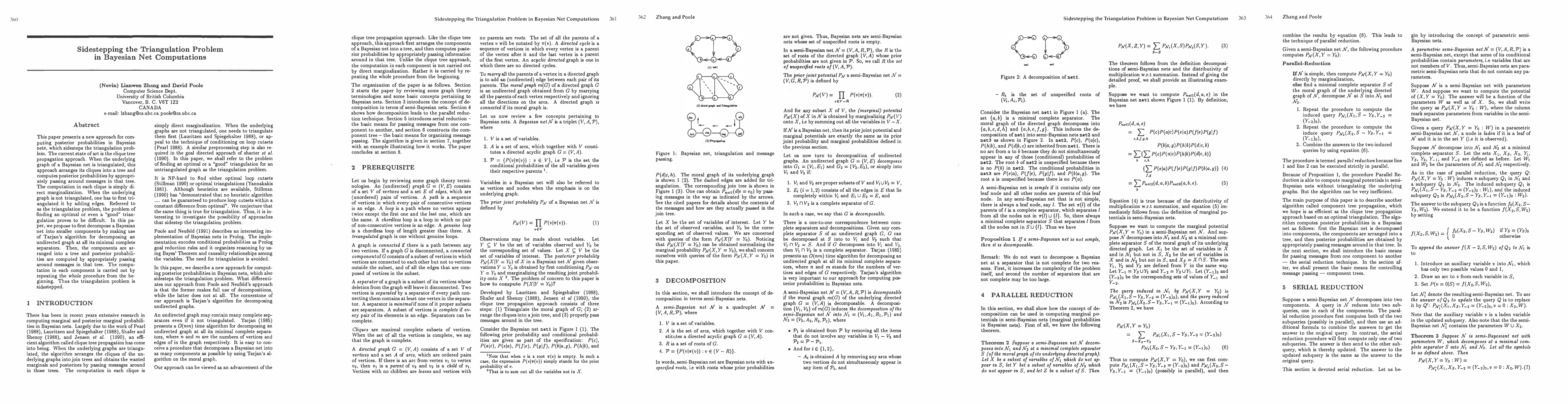 This paper presents a new approach for computing posterior probabilities in Bayesian nets, which sidesteps the triangulation problem. The current state of art is the clique tree propagation approach. When the underlying graph of a Bayesian net is triangulated, this approach arranges its cliques into a tree and computes posterior probabilities by appropriately passing around messages in that tree. The computation in each clique is simply direct marginalization. When the underlying graph is not triangulated, one has to first triangulated it by adding edges. Referred to as the triangulation problem, the problem of finding an optimal or even a ?good? triangulation proves to be difficult. In this paper, we propose to first decompose a Bayesian net into smaller components by making use of Tarjan's algorithm for decomposing an undirected graph at all its minimal complete separators. Then, the components are arranged into a tree and posterior probabilities are computed by appropriately passing around messages in that tree. The computation in each component is carried out by repeating the whole procedure from the beginning. Thus the triangulation problem is sidestepped.