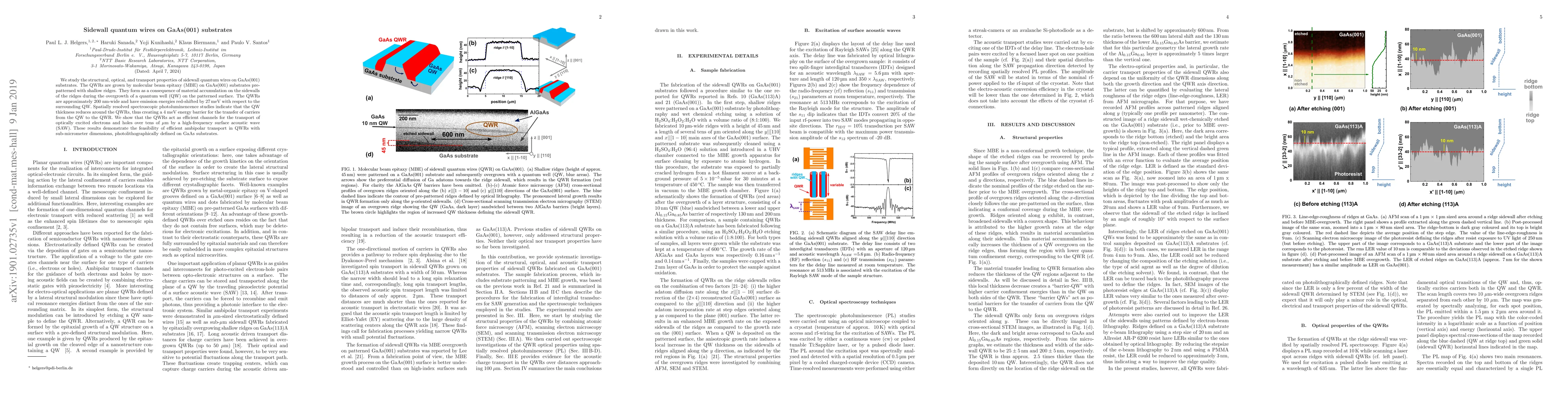 This paper investigates sidewall quantum wires (QWRs) on GaAs substrates, grown via molecular beam epitaxy on prepatterned ridges, revealing their structural, optical, and transport properties. The QWRs facilitate efficient ambipolar transport of carriers over micrometer distances via surface acoustic waves.