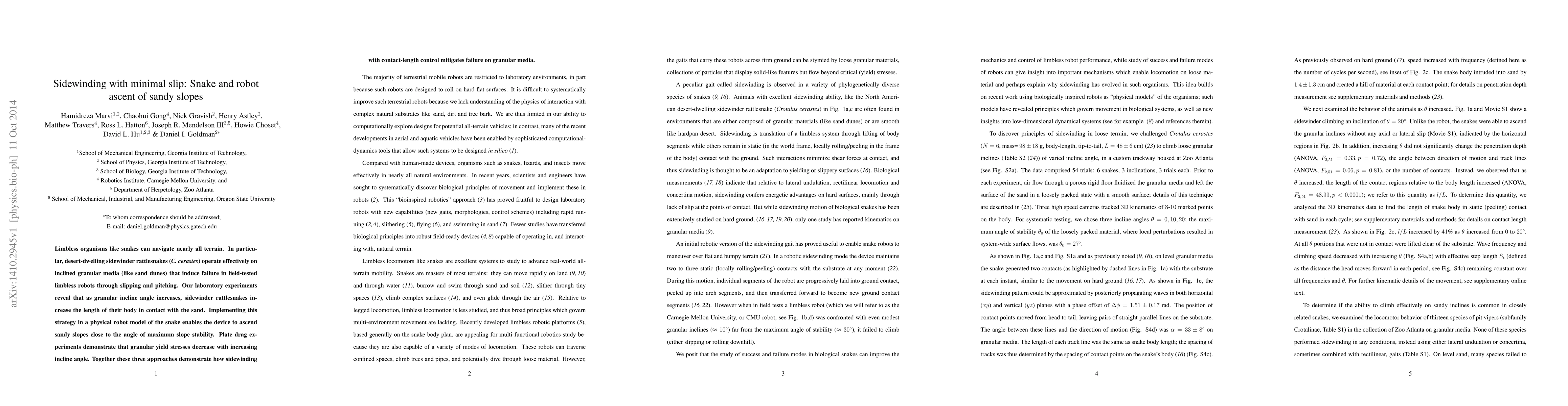 Limbless organisms such as snakes can navigate nearly all terrain. In particular, desert-dwelling sidewinder rattlesnakes (Crotalus cerastes) operate effectively on inclined granular media (such as sand dunes) that induce failure in field-tested limbless robots through slipping and pitching. Our laboratory experiments reveal that as granular incline angle increases, sidewinder rattlesnakes increase the length of their body in contact with the sand. Implementing this strategy in a physical robot model of the snake enables the device to ascend sandy slopes close to the angle of maximum slope stability. Plate drag experiments demonstrate that granular yield stresses decrease with increasing incline angle. Together, these three approaches demonstrate how sidewinding with contact-length control mitigates failure on granular media.