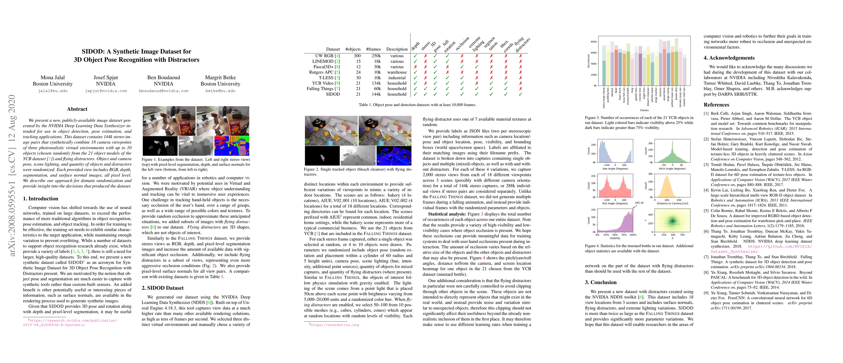 We present a new, publicly-available image dataset generated by the NVIDIA Deep Learning Data Synthesizer intended for use in object detection, pose estimation, and tracking applications. This dataset contains 144k stereo image pairs that synthetically combine 18 camera viewpoints of three photorealistic virtual environments with up to 10 objects (chosen randomly from the 21 object models of the YCB dataset [1]) and flying distractors. Object and camera pose, scene lighting, and quantity of objects and distractors were randomized. Each provided view includes RGB, depth, segmentation, and surface normal images, all pixel level. We describe our approach for domain randomization and provide insight into the decisions that produced the dataset.