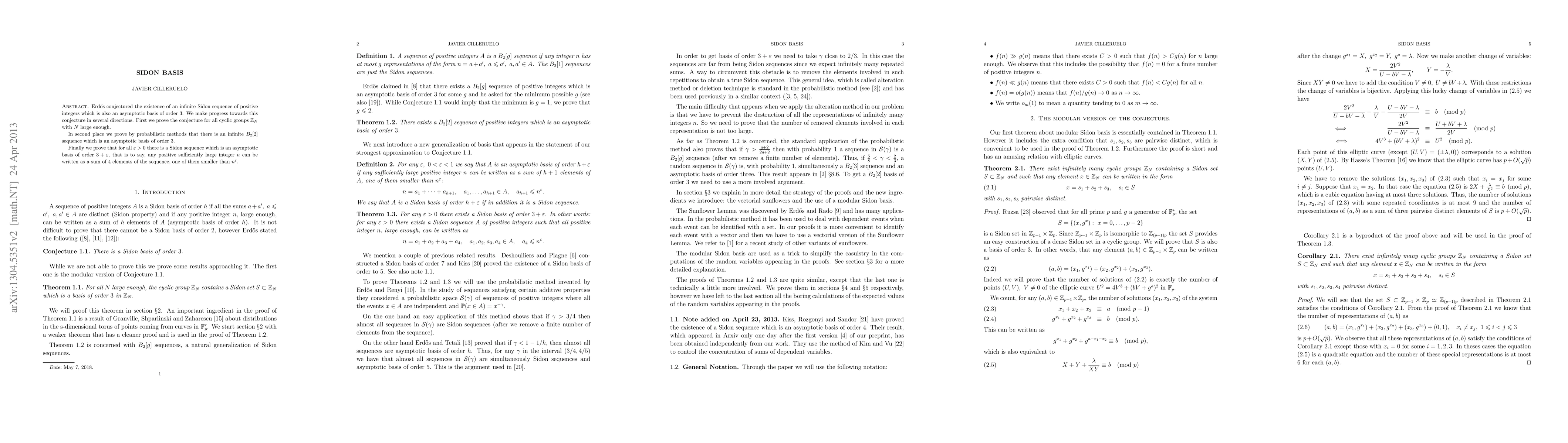 This paper advances Erdős' conjecture on the existence of an infinite Sidon sequence that serves as an asymptotic basis of order 3. The authors prove the conjecture for large cyclic groups Z_N and demonstrate the existence of an infinite B_2[2] sequence that meets the asymptotic basis criteria. Additionally, they show that for any positive c, there exists a Sidon sequence that functions as an asymptotic basis of order 3+c.