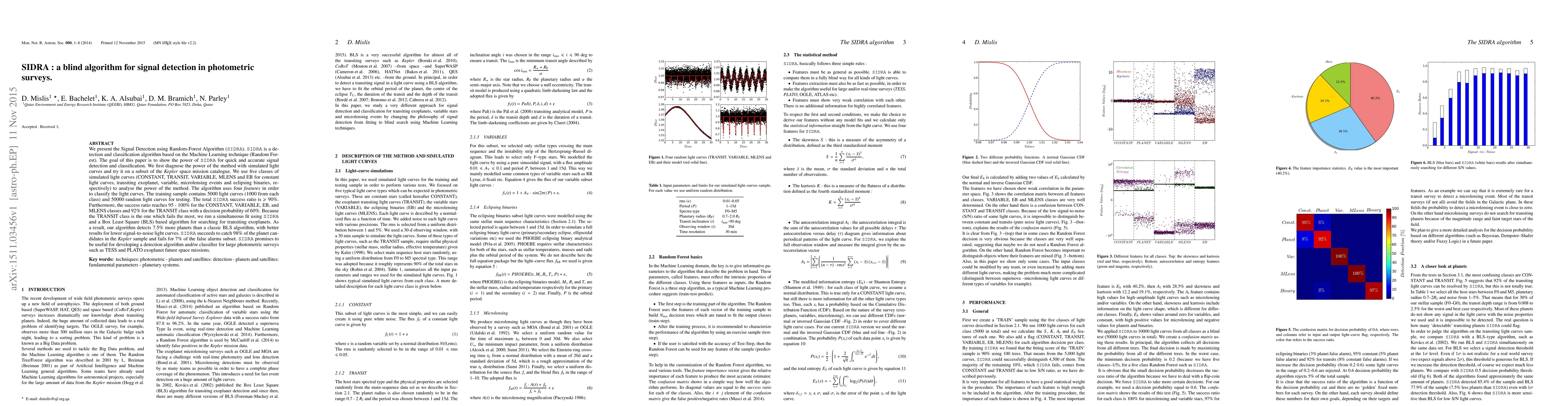 SIDRA, a Random Forest-based algorithm for signal detection in photometric surveys, achieves a success ratio of ≥90% in classifying light curves into five classes, detecting 7.5% more planets than traditional methods for transiting exoplanets, and showing promise for future large-scale exoplanet surveys like TESS and PLATO.