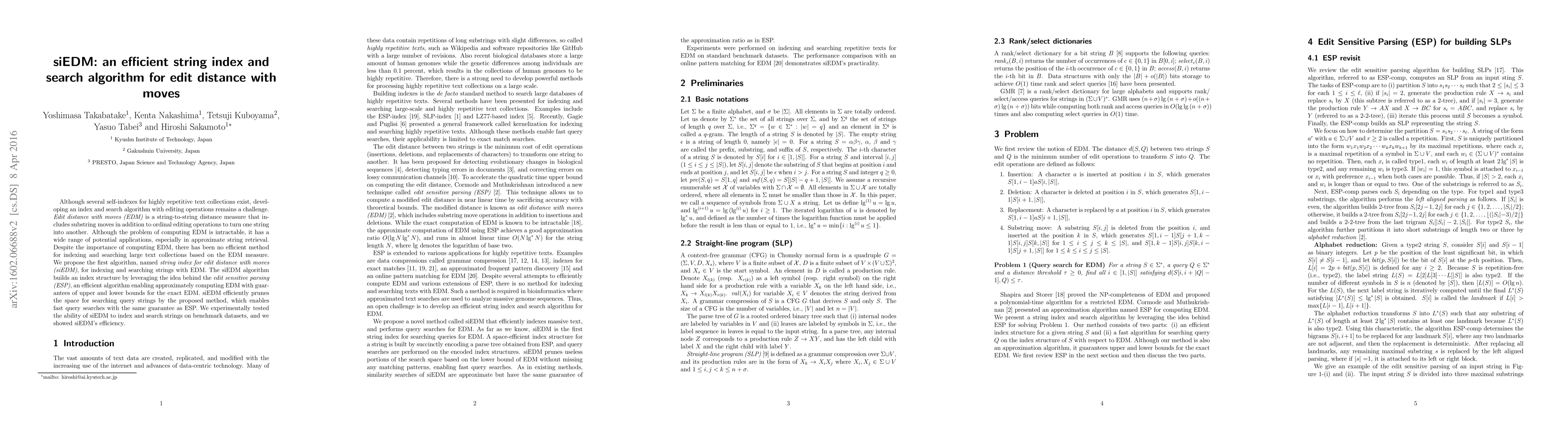 The siEDM algorithm introduces an efficient index and search method for strings based on Edit Distance with Moves (EDM), leveraging edit sensitive parsing to provide upper and lower bounds for exact EDM. Experimental results demonstrate siEDM's effectiveness in indexing and searching large text collections with fast query performance.