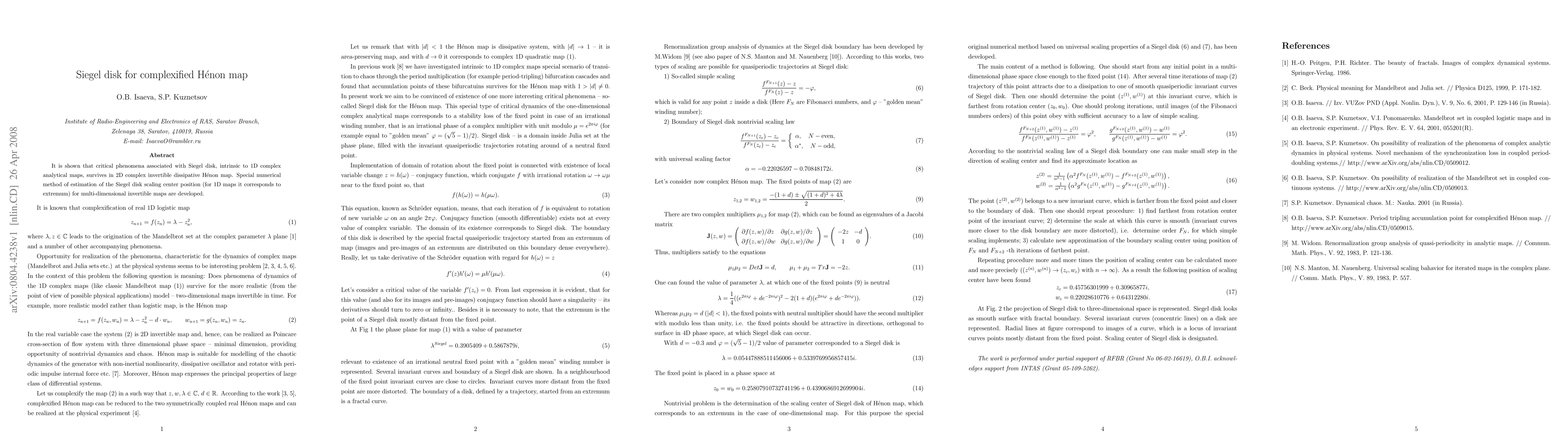 It is shown that critical phenomena associated with Siegel disk, intrinsic to 1D complex analytical maps, survives in 2D complex invertible dissipative H\'{e}non map. Special numerical method of estimation of the Siegel disk scaling center position (for 1D maps it corresponds to extremum) for multi-dimensional invertible maps are developed.