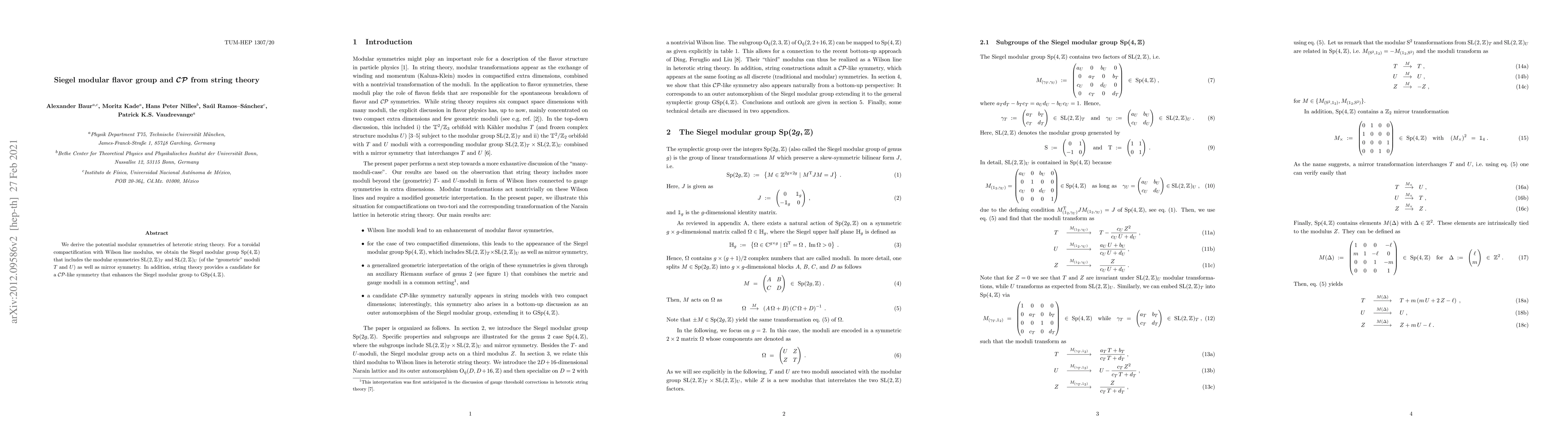 We derive the potential modular symmetries of heterotic string theory. For a toroidal compactification with Wilson line modulus, we obtain the Siegel modular group $\mathrm{Sp}(4,\mathbb{Z})$ that includes the modular symmetries $\mathrm{SL}(2,\mathbb{Z})_T$ and $\mathrm{SL}(2,\mathbb{Z})_U$ (of the "geometric" moduli $T$ and $U$) as well as mirror symmetry. In addition, string theory provides a candidate for a CP-like symmetry that enhances the Siegel modular group to $\mathrm{GSp}(4,\mathbb{Z})$.