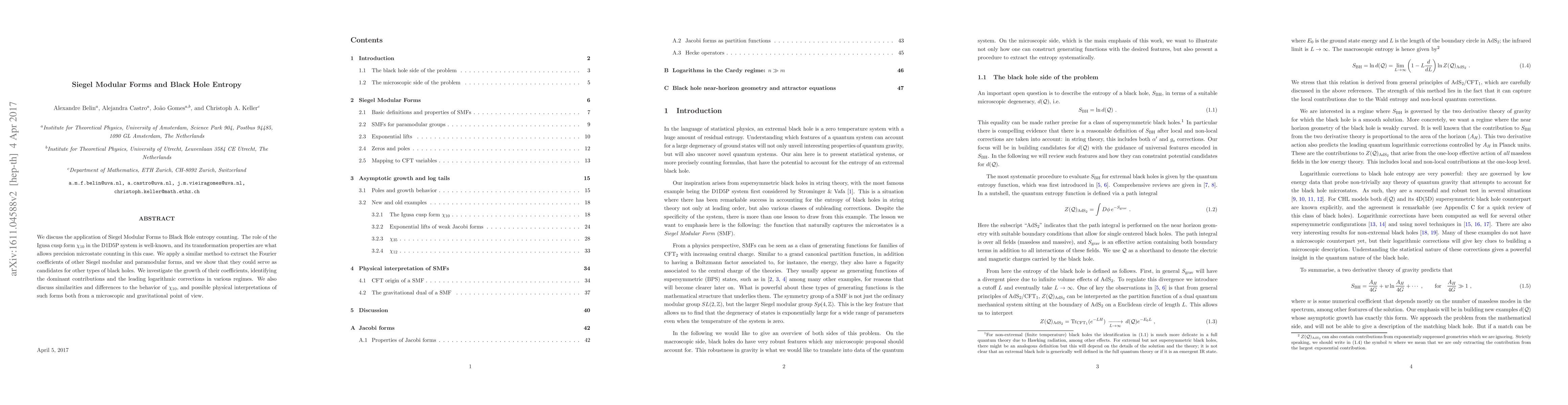 We discuss the application of Siegel Modular Forms to Black Hole entropy counting. The role of the Igusa cusp form $\chi_{10}$ in the D1D5P system is well-known, and its transformation properties are what allows precision microstate counting in this case. We apply a similar method to extract the Fourier coefficients of other Siegel modular and paramodular forms, and we show that they could serve as candidates for other types of black holes. We investigate the growth of their coefficients, identifying the dominant contributions and the leading logarithmic corrections in various regimes. We also discuss similarities and differences to the behavior of $\chi_{10}$, and possible physical interpretations of such forms both from a microscopic and gravitational point of view.