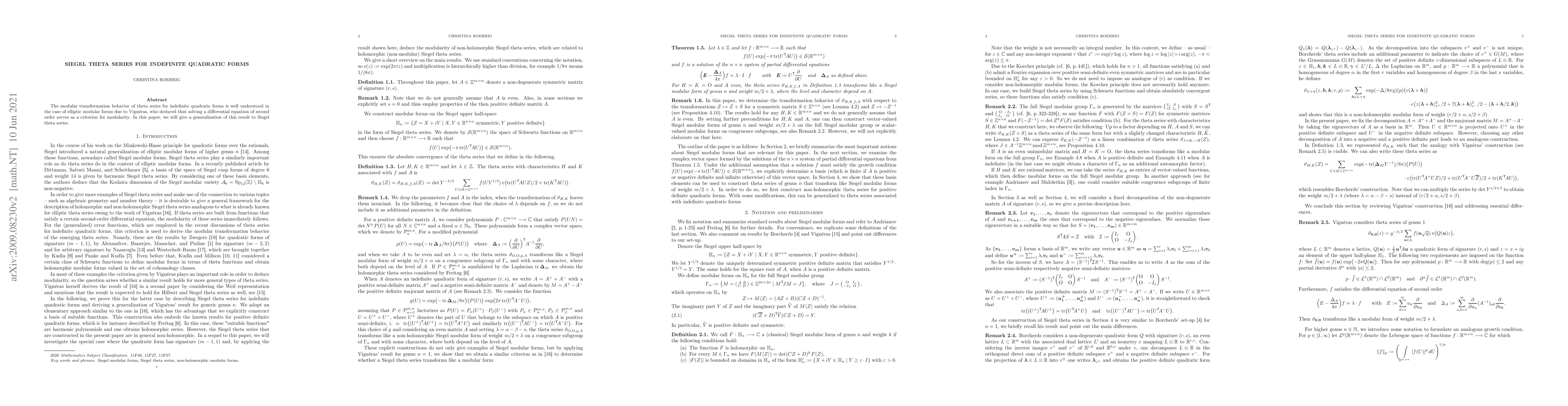 This paper generalizes Vignera's criterion for modularity of theta series to Siegel theta series for indefinite quadratic forms, establishing that solving a second-order differential equation serves as a criterion for their modularity.