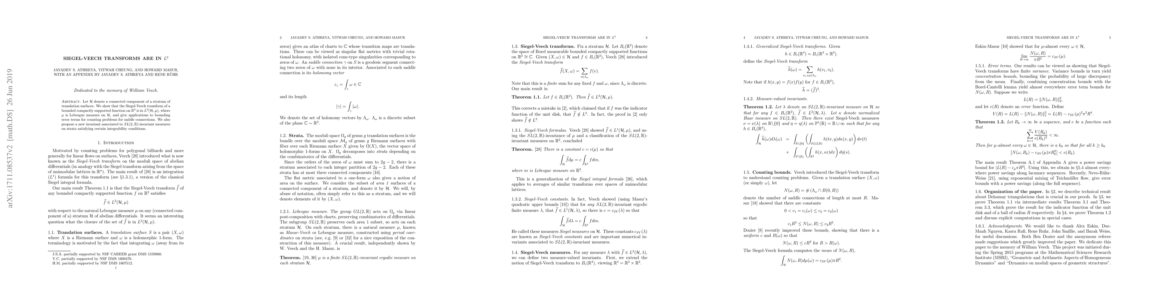 Researchers prove that a specific mathematical transformation related to translation surfaces is square-integrable, with implications for counting problems and proposed new invariant measures.