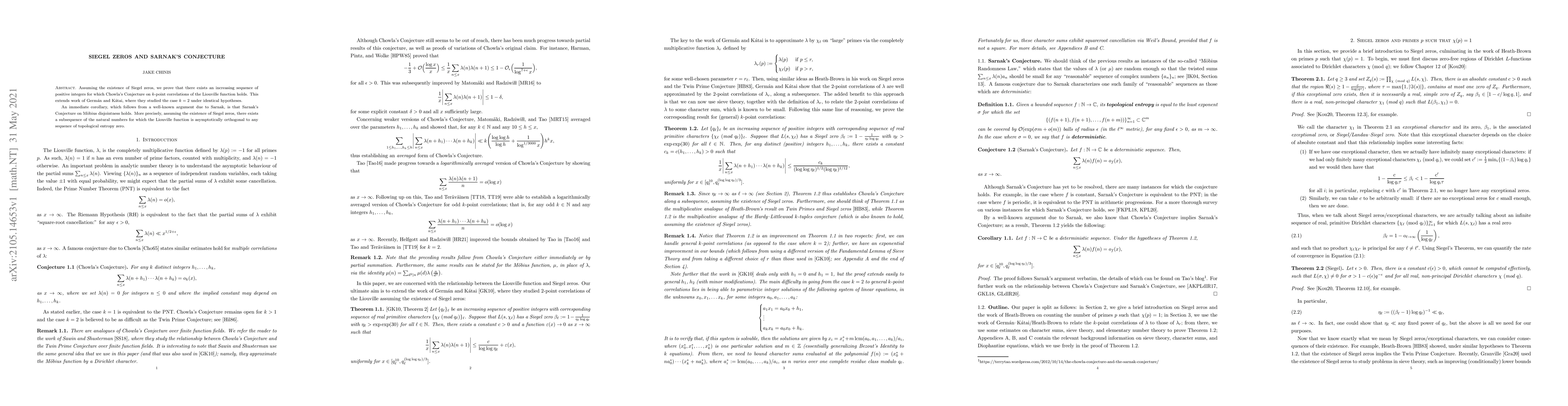 This research contributes to the understanding of number theory by linking Siegel zeros, Chowla's Conjecture, and Sarnak's Conjecture, thereby advancing the ergodic theory perspective on multiplicative functions.