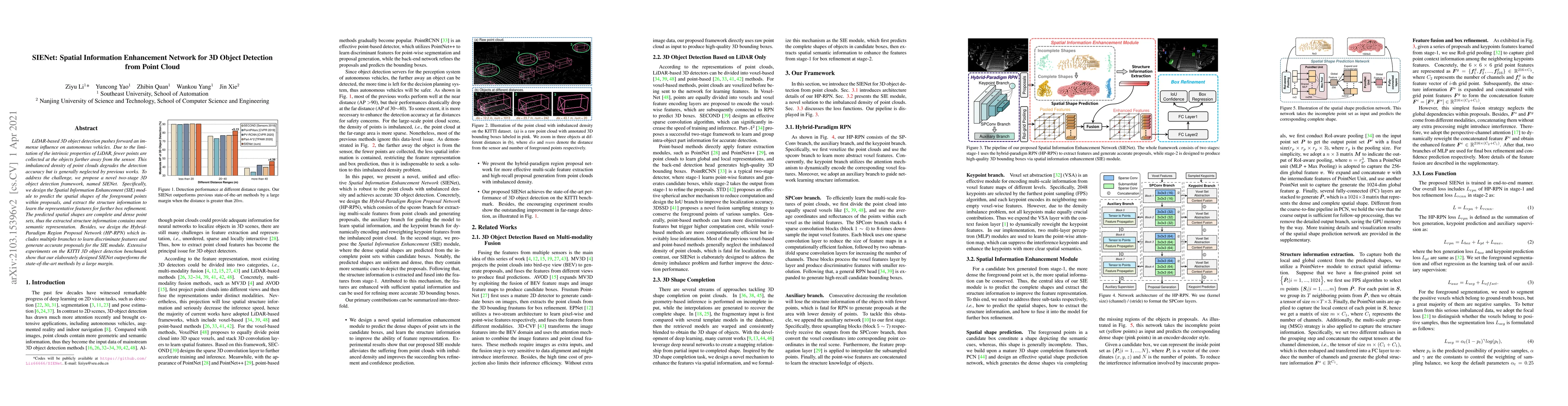 SIENet introduces a Spatial Information Enhancement module to address the imbalanced density of LiDAR point clouds, improving 3D object detection accuracy. The Hybrid-Paradigm Region Proposal Network generates precise proposals, leading to superior performance on the KITTI benchmark compared to existing methods.