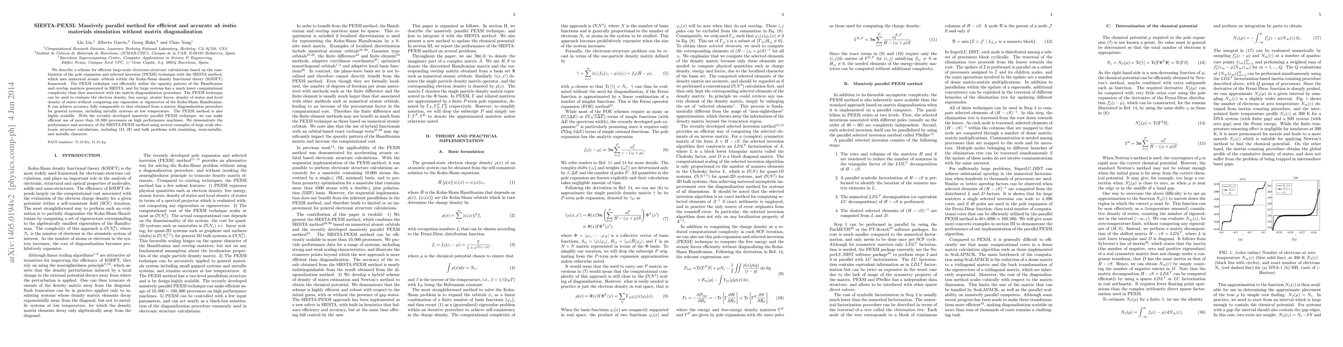 The SIESTA-PEXSI method combines the PEXSI technique with the SIESTA method for efficient large-scale electronic-structure calculations, achieving lower computational complexity than matrix diagonalization without sacrificing accuracy. It leverages parallel computing to utilize thousands of processors for scalable simulations.
