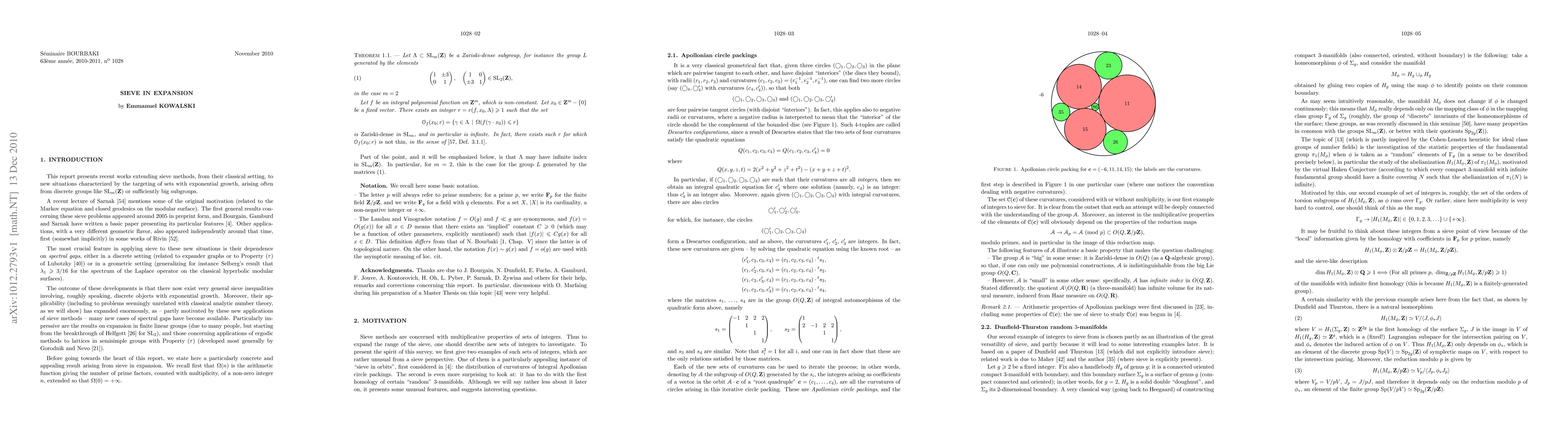 This survey discusses recent advancements in sieve theory and expander graphs, focusing on Bourgain, Gamburd, and Sarnak's "sieve in orbits" and the expansion properties of Cayley graphs of finite linear groups. It highlights significant developments in these areas from the Bourbaki Seminar (Exp. no. 1028, November 2010).