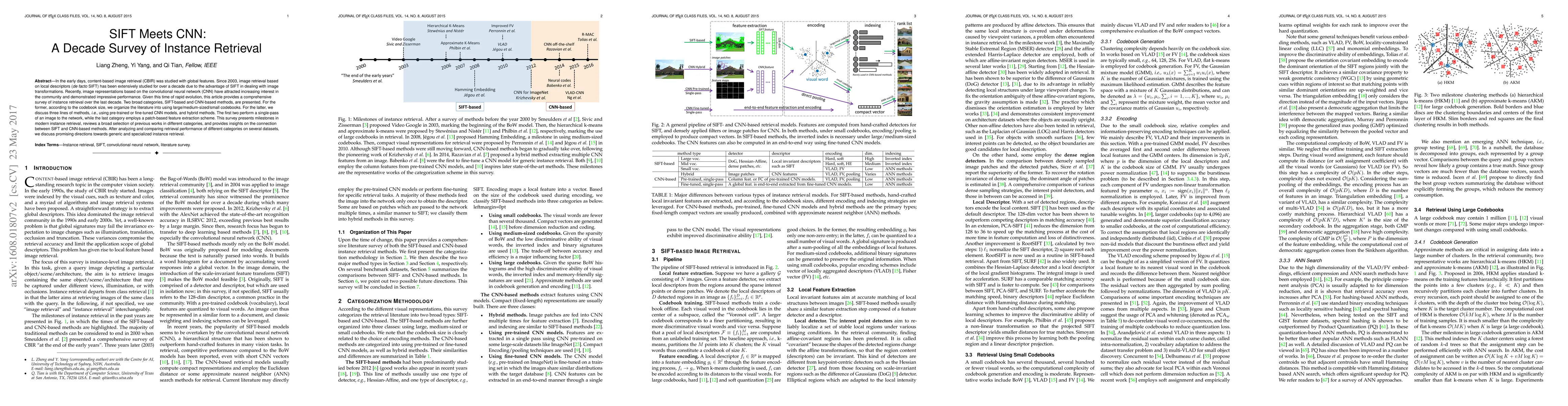 In the early days, content-based image retrieval (CBIR) was studied with global features. Since 2003, image retrieval based on local descriptors (de facto SIFT) has been extensively studied for over a decade due to the advantage of SIFT in dealing with image transformations. Recently, image representations based on the convolutional neural network (CNN) have attracted increasing interest in the community and demonstrated impressive performance. Given this time of rapid evolution, this article provides a comprehensive survey of instance retrieval over the last decade. Two broad categories, SIFT-based and CNN-based methods, are presented. For the former, according to the codebook size, we organize the literature into using large/medium-sized/small codebooks. For the latter, we discuss three lines of methods, i.e., using pre-trained or fine-tuned CNN models, and hybrid methods. The first two perform a single-pass of an image to the network, while the last category employs a patch-based feature extraction scheme. This survey presents milestones in modern instance retrieval, reviews a broad selection of previous works in different categories, and provides insights on the connection between SIFT and CNN-based methods. After analyzing and comparing retrieval performance of different categories on several datasets, we discuss promising directions towards generic and specialized instance retrieval.