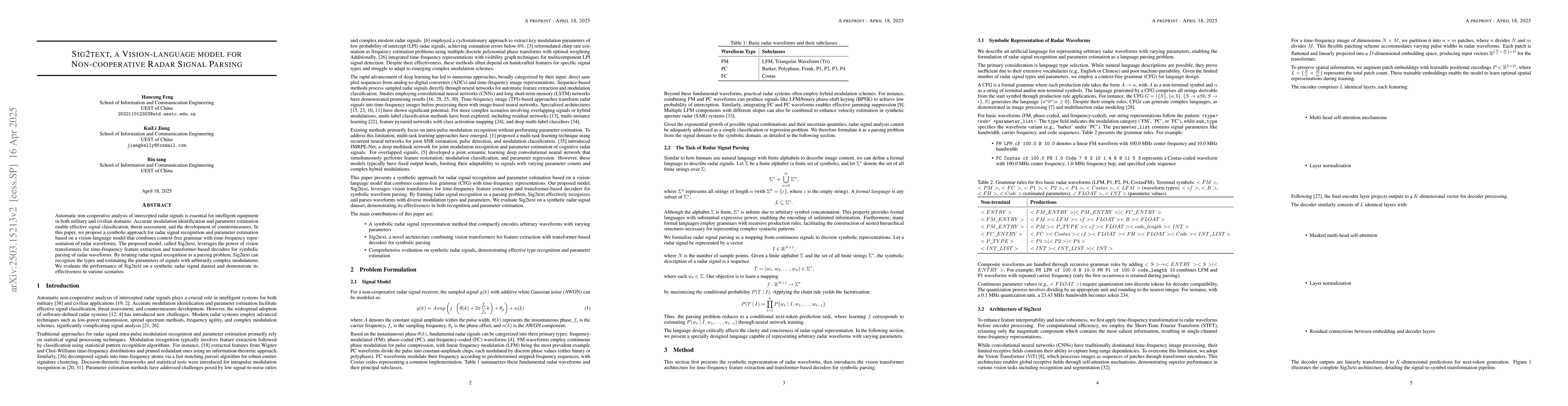 This paper introduces Sig2text, a vision-language model for parsing non-cooperative radar signals, combining context-free grammar with time-frequency representations. The model uses vision transformers for feature extraction and transformer-based decoders for symbolic parsing, demonstrating effective recognition and parsing of radar waveforms with different modulation types and parameters.