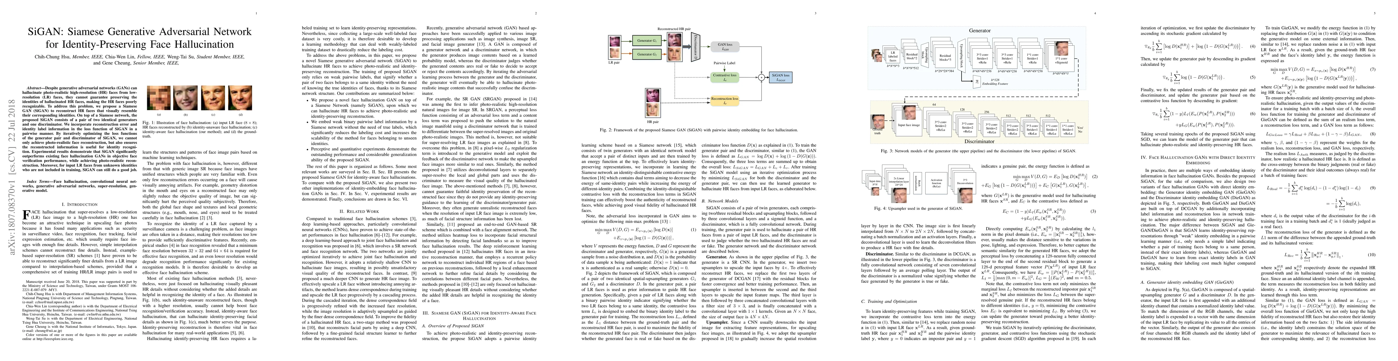 The SiGAN model proposes a Siamese GAN to hallucinate high-resolution faces from low-resolution inputs while preserving the identity, outperforming existing methods in both photo-realism and identity recognition accuracy. Experimental results show significant improvements over other GANs in face verification tasks.