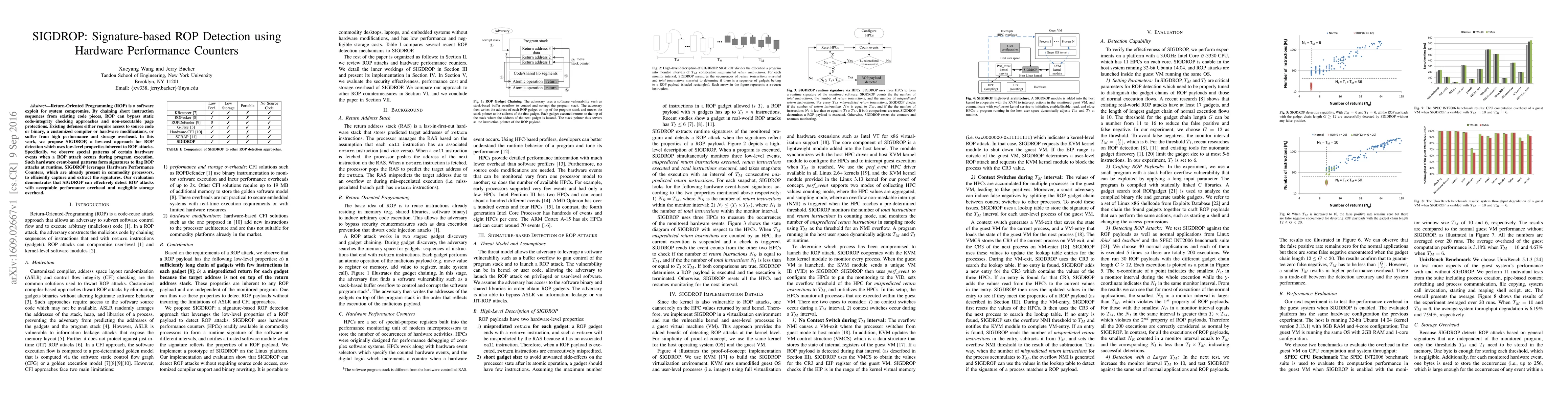 SIGDROP is a low-cost ROP detection method that leverages hardware performance counters to identify ROP attacks by detecting unique execution patterns. It efficiently captures signatures of ROP attacks at runtime without requiring source code, compiler modifications, or significant performance/storage overhead.