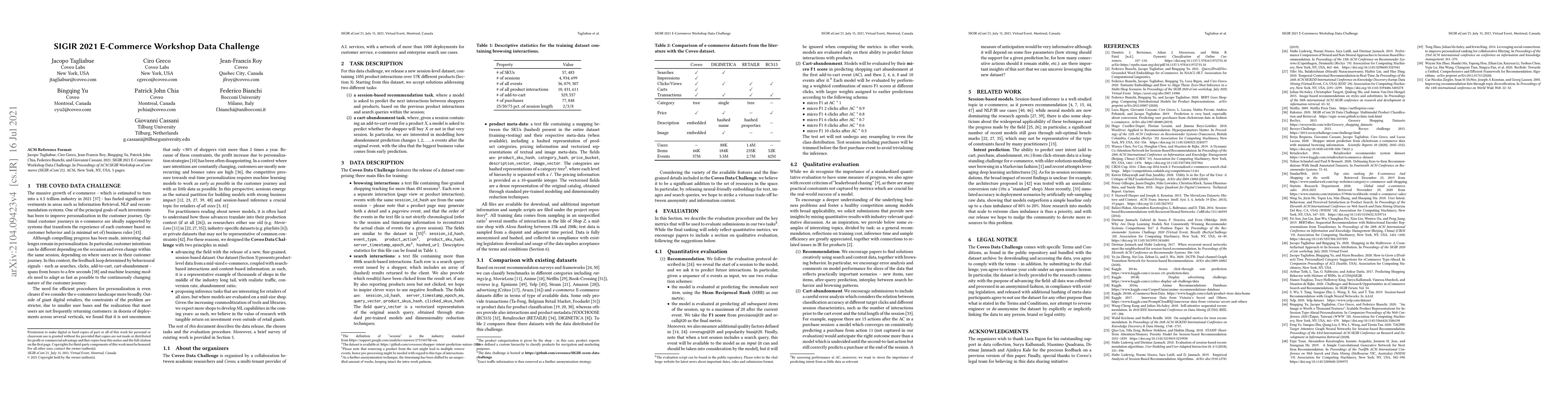 The 2021 SIGIR eCommerce workshop introduces the Coveo Data Challenge focusing on in-session prediction for purchase intent and recommendations, releasing a dataset with over 30M browsing events to tackle these challenges. The competition aims to develop models for predicting future product interactions and purchase intent within a shopping session.