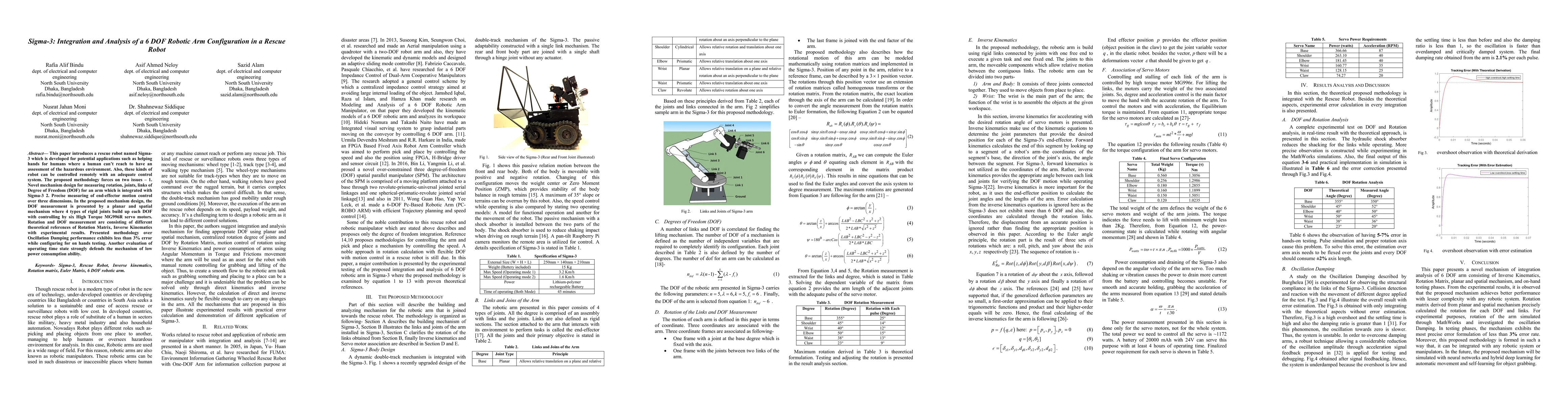 This paper introduces a rescue robot named Sigma 3 which is developed for potential applications such as helping hands for humans where a human can not reach to have an assessment of the hazardous environment. Also, these kinds of robot can be controlled remotely with an adequate control system. The proposed methodology forces on two issues : 1. Novel mechanism design for measuring rotation, joints, links of Degree of Freedom DOF for an arm which is integrated with Sigma 3, 2. Precise measuring of end effector motion control over three dimensions. In the proposed mechanism design, the DOF measurement is presented by a planar and spatial mechanism where 4 types of rigid joints build up each DOF with controlling by six High Torque MG996R servo motors. Rotation and DOF measurement are consisting of different theoretical references of Rotation Matrix, Inverse Kinematics with experimental results. Presented methodology over Oscillation Damping performance exhibits less than 3 percent error while configuring for on hands testing. Another evaluation of operating time state strongly defends the mechanism of low power consumption ability.