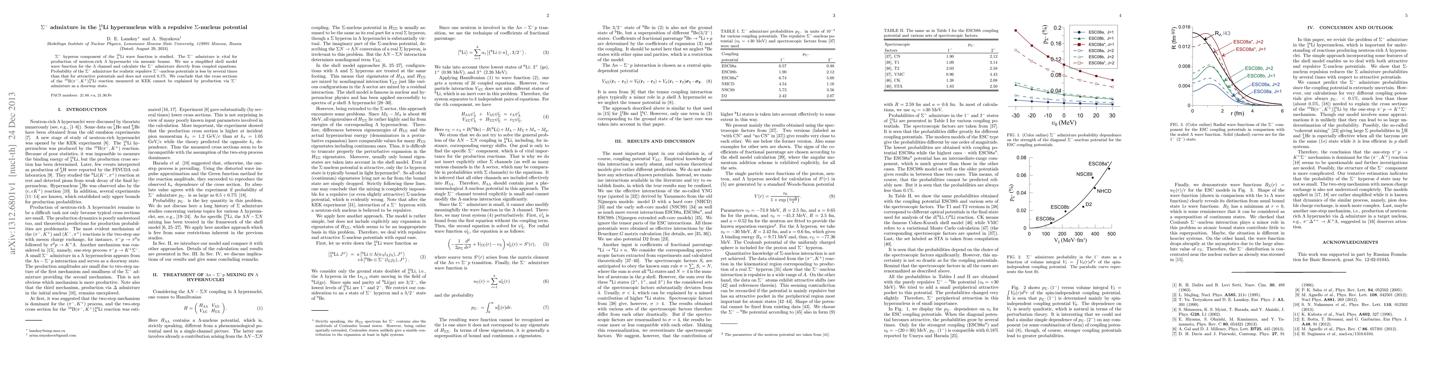 $\Sigma^-$ hyperon component of the $^{10}_\Lambda$Li wave function is studied. The $\Sigma^-$ admixture is vital for production of neutron-rich $\Lambda$ hypernuclei via mesonic beams. We use a simplified shell model wave function for the $\Lambda$ channel and calculate the $\Sigma^-$ admixture directly from coupled equations. Probability of the $\Sigma^-$ admixture for realistic repulsive $\Sigma^-$-nucleus potentials is less by several times than that for attractive potentials and does not exceed $0.1\%$. We conclude that the cross sections of the $^{10}\mbox{B}(\pi^-,K^+){}^{10}_\Lambda\mbox{Li}$ reaction measured at KEK cannot be explained by production via $\Sigma^-$ admixture as a doorway state.