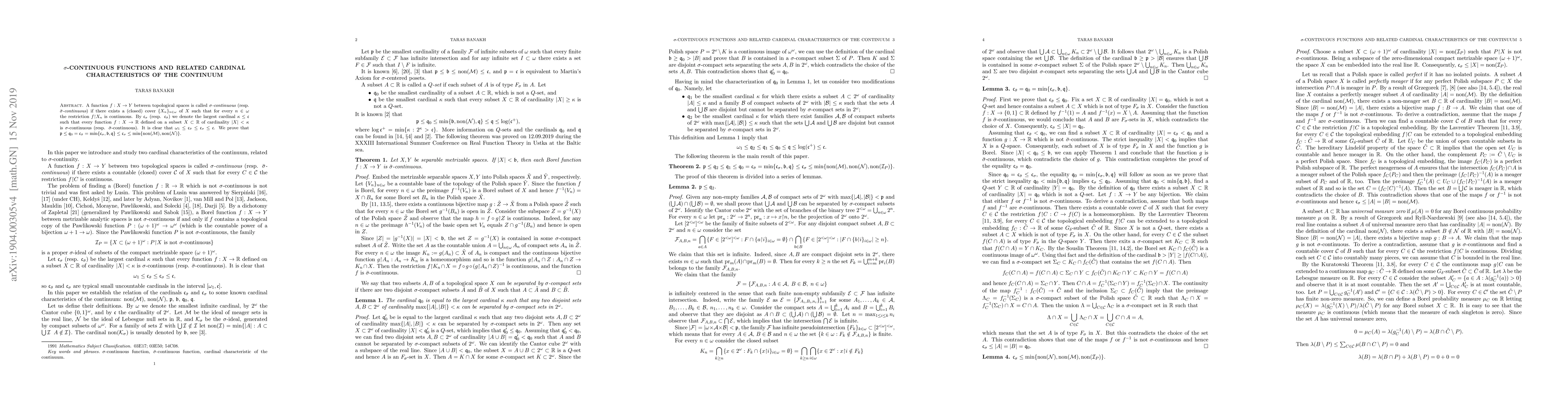 A function $f:X\to Y$ between topological spaces is called $\sigma$-$continuous$ (resp. $\bar\sigma$-$continuous$) if there exists a (closed) cover $\{X_n\}_{n\in\omega}$ of $X$ such that for every $n\in\omega$ the restriction $f{\restriction}X_n$ is continuous. By $\mathfrak c_\sigma$ (resp. $\mathfrak c_{\bar\sigma}$) we denote the largest cardinal $\kappa\le\mathfrak c$ such that every function $f:X\to\mathbb R$ defined on a subset $X\subset\mathbb R$ of cardinality $|X|<\kappa$ is $\sigma$-continuous (resp. $\bar\sigma$-continuous). It is clear that $\omega_1\le\mathfrak c_{\bar\sigma}\le\mathfrak c_\sigma\le\mathfrak c$. We prove that $\mathfrak p\le\mathfrak q_0=\mathfrak c_{\bar\sigma}=\min\{\mathfrak c_\sigma,\mathfrak b,\mathfrak q\}\le\mathfrak c_\sigma\le\min\{\mathrm{non}(\mathcal M),\mathrm{non}(\mathcal N)\}$. The equality $\mathfrak c_{\bar\sigma}=\mathfrak q_0$ resolves a problem from the initial version of the paper.