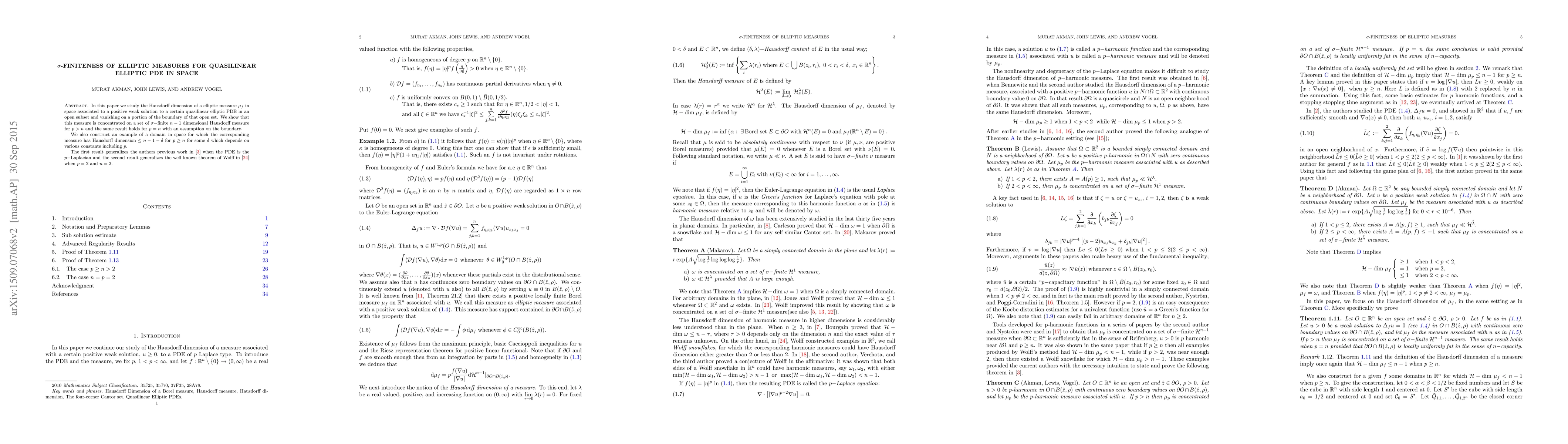 In this paper we study the Hausdorff dimension of a elliptic measure $\mu_{f}$ in space associated to a positive weak solution to a certain quasilinear elliptic PDE in an open subset and vanishing on a portion of the boundary of that open set. We show that this measure is concentrated on a set of $\sigma-$finite $n-1$ dimensional Hausdorff measure for $p>n$ and the same result holds for $p=n$ with an assumption on the boundary. We also construct an example of a domain in space for which the corresponding measure has Hausdorff dimension $\leq n-1-\delta$ for $p\geq n$ for some $\delta$ which depends on various constants including $p$. The first result generalizes the authors previous work when the PDE is the $p-$Laplacian and the second result generalizes the well known theorem of Wolff when $p=2$ and $n=2$.