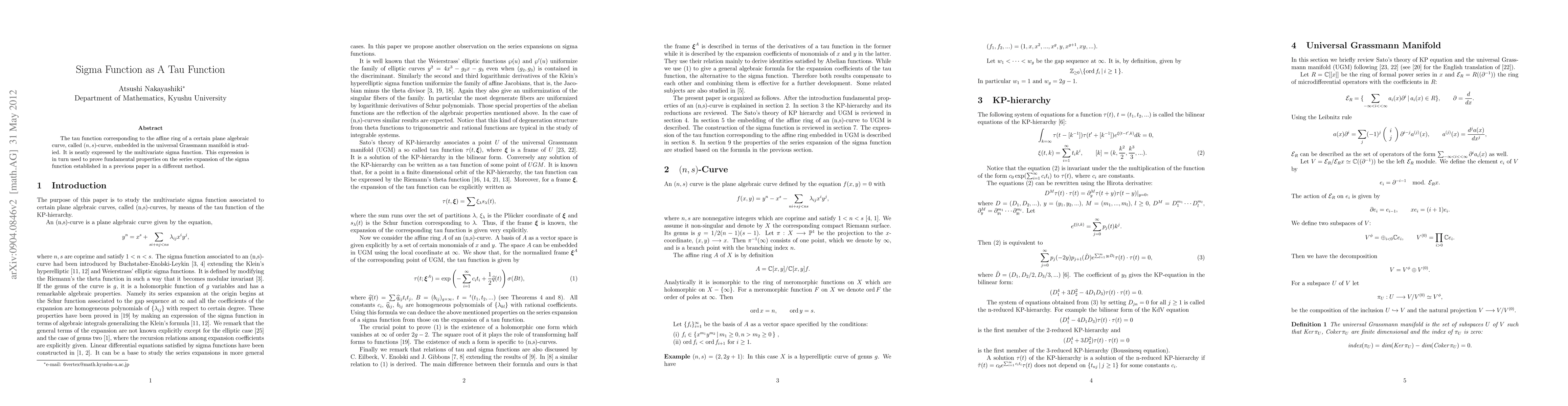 The tau function corresponding to the affine ring of a certain plane algebraic curve, called (n,s)-curve, embedded in the universal Grassmann manifold is studied. It is neatly expressed by the multivariate sigma function. This expression is in turn used to prove fundamental properties on the series expansion of the sigma function established in a previous paper in a different method.