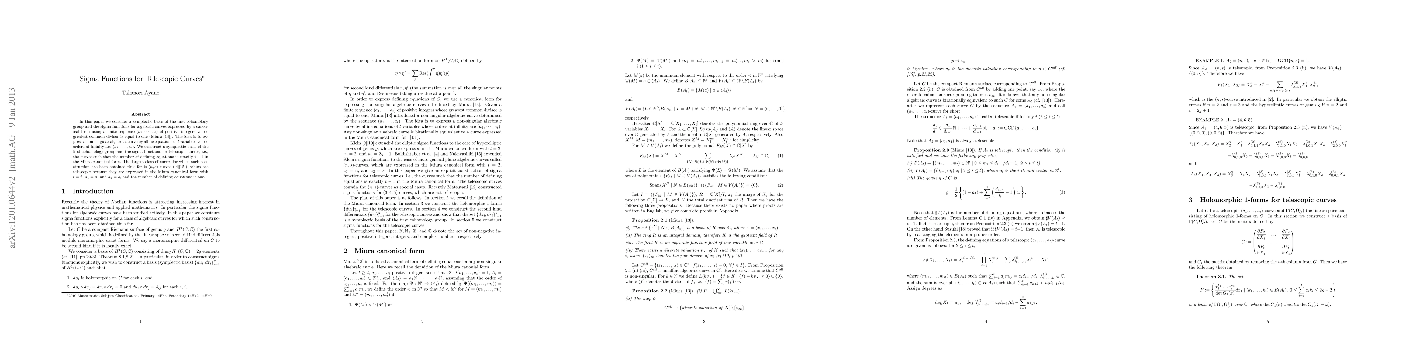 This paper explores sigma functions for telescopic algebraic curves defined by a Miura canonical form, constructing a symplectic basis for their first cohomology group and detailing the construction for $(n,s)$-curves, which are a specific class of telescopic curves.