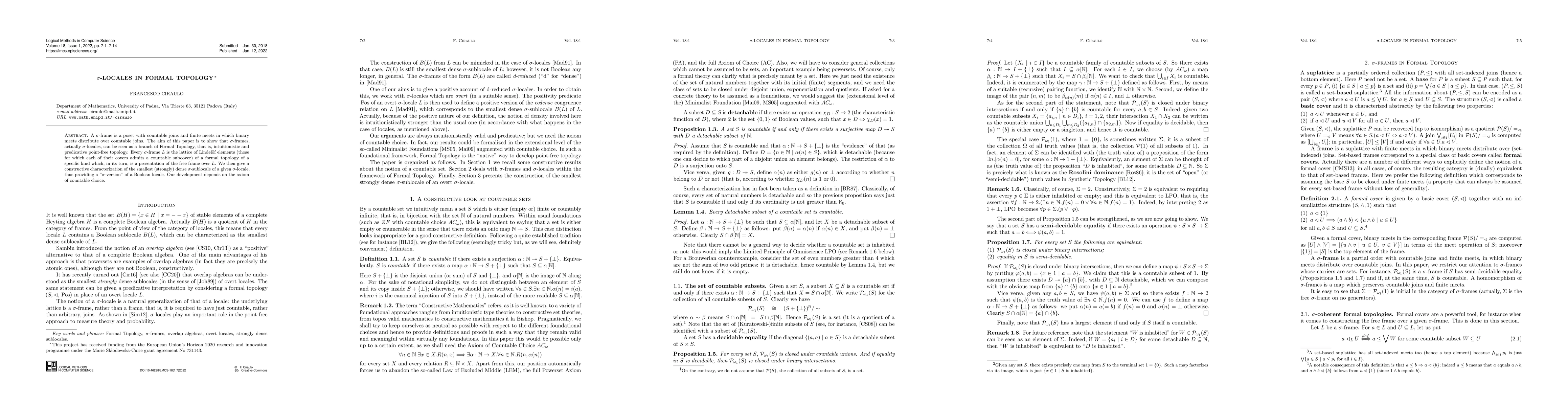 A $\sigma$-frame is a poset with countable joins and finite meets in which binary meets distribute over countable joins. The aim of this paper is to show that $\sigma$-frames, actually $\sigma$-locales, can be seen as a branch of Formal Topology, that is, intuitionistic and predicative point-free topology. Every $\sigma$-frame $L$ is the lattice of Lindel\"of elements (those for which each of their covers admits a countable subcover) of a formal topology of a specific kind which, in its turn, is a presentation of the free frame over $L$. We then give a constructive characterization of the smallest (strongly) dense $\sigma$-sublocale of a given $\sigma$-locale, thus providing a "$\sigma$-version" of a Boolean locale. Our development depends on the axiom of countable choice.