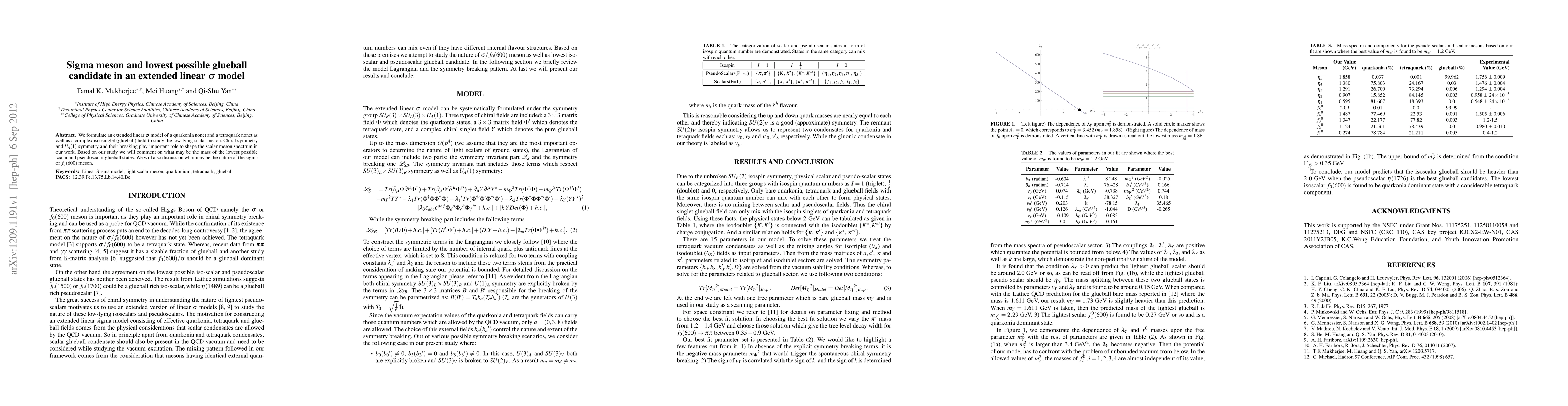 This paper formulates an extended linear $\sigma$ model to study low-lying scalar mesons, including quarkonia, tetraquarks, and a glueball field. It examines the impact of chiral symmetry and $U_A(1)$ symmetry breaking on the meson spectrum, aiming to determine the mass of the lowest possible glueball states and the nature of the sigma or $f_0(600)$ meson.