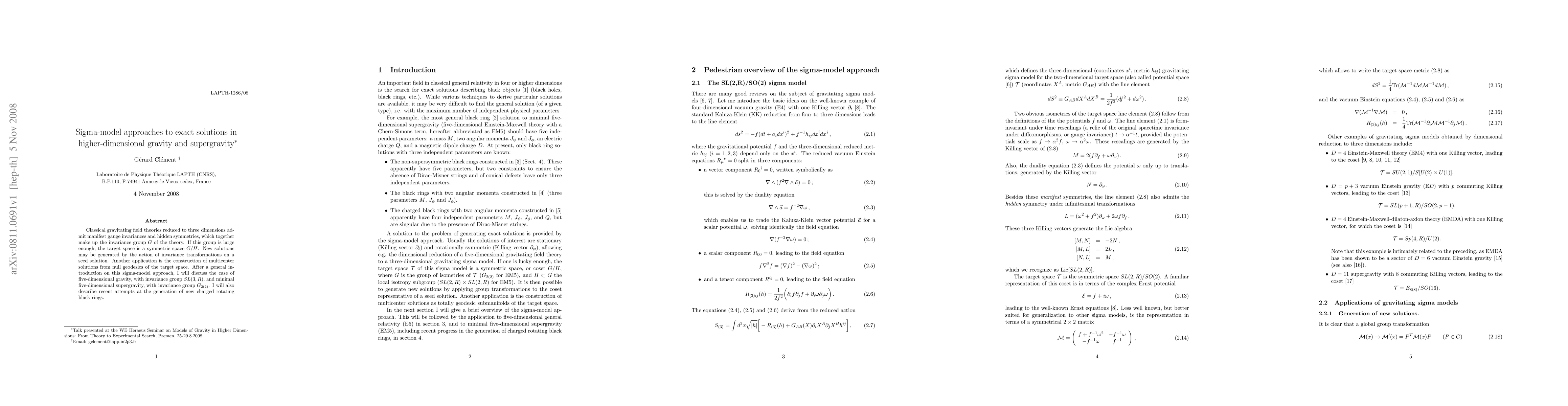 Classical gravitating field theories reduced to three dimensions admit manifest gauge invariances and hidden symmetries, which together make up the invariance group G of the theory. If this group is large enough, the target space is a symmetric space G/H. New solutions may be generated by the action of invariance transformations on a seed solution. Another application is the construction of multicenter solutions from null geodesics of the target space. After a general introduction on this sigma-model approach, I will discuss the case of five-dimensional gravity, with invariace group SL(3,R), and minimal five-dimensional supergravity, with invariance group G_{2(2)}. I will also describe recent attempts at the generation of new charged rotating black rings.