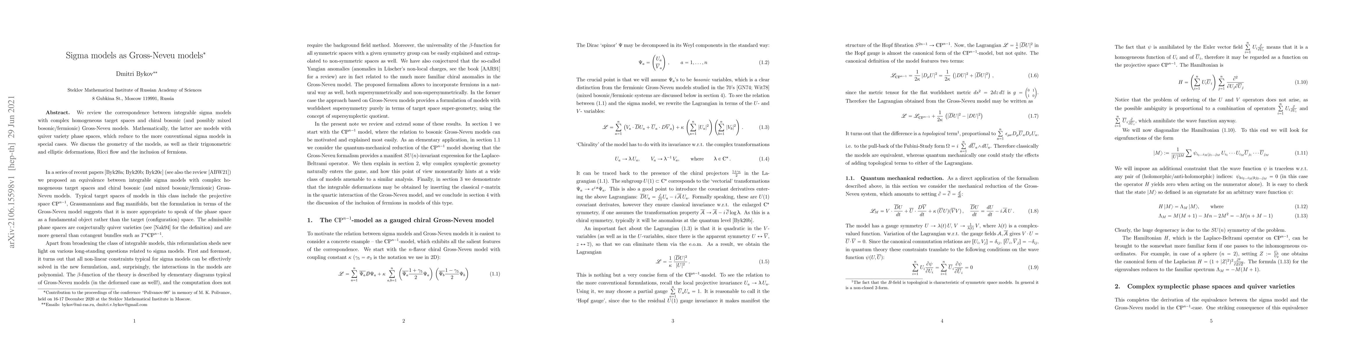 We review the correspondence between integrable sigma models with complex homogeneous target spaces and chiral bosonic (and possibly mixed bosonic/fermionic) Gross-Neveu models. Mathematically, the latter are models with quiver variety phase spaces, which reduce to the more conventional sigma models in special cases. We discuss the geometry of the models, as well as their trigonometric and elliptic deformations, Ricci flow and the inclusion of fermions.