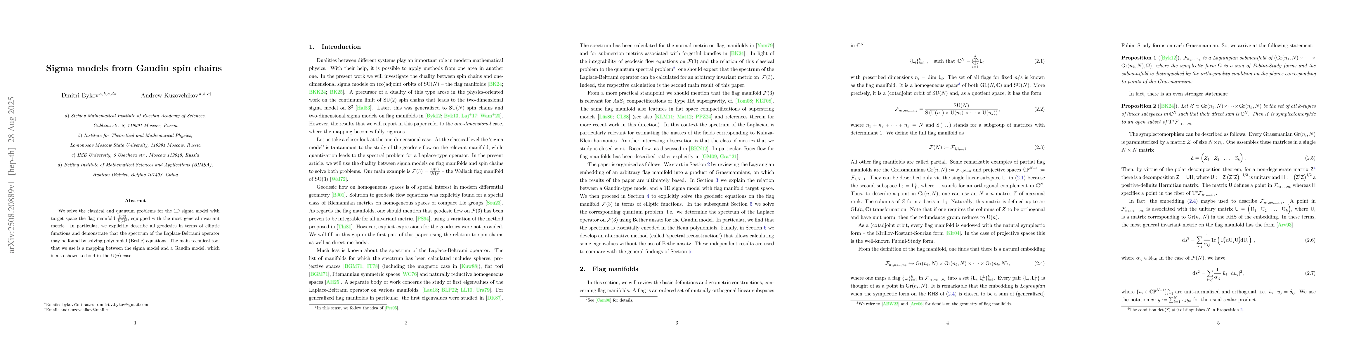 We solve the classical and quantum problems for the 1D sigma model with target space the flag manifold $\mathrm{U}(3)\over \mathrm{U}(1)^3$, equipped with the most general invariant metric. In particular, we explicitly describe all geodesics in terms of elliptic functions and demonstrate that the spectrum of the Laplace-Beltrami operator may be found by solving polynomial (Bethe) equations. The main technical tool that we use is a mapping between the sigma model and a Gaudin model, which is also shown to hold in the $\mathrm{U}(n)$ case.