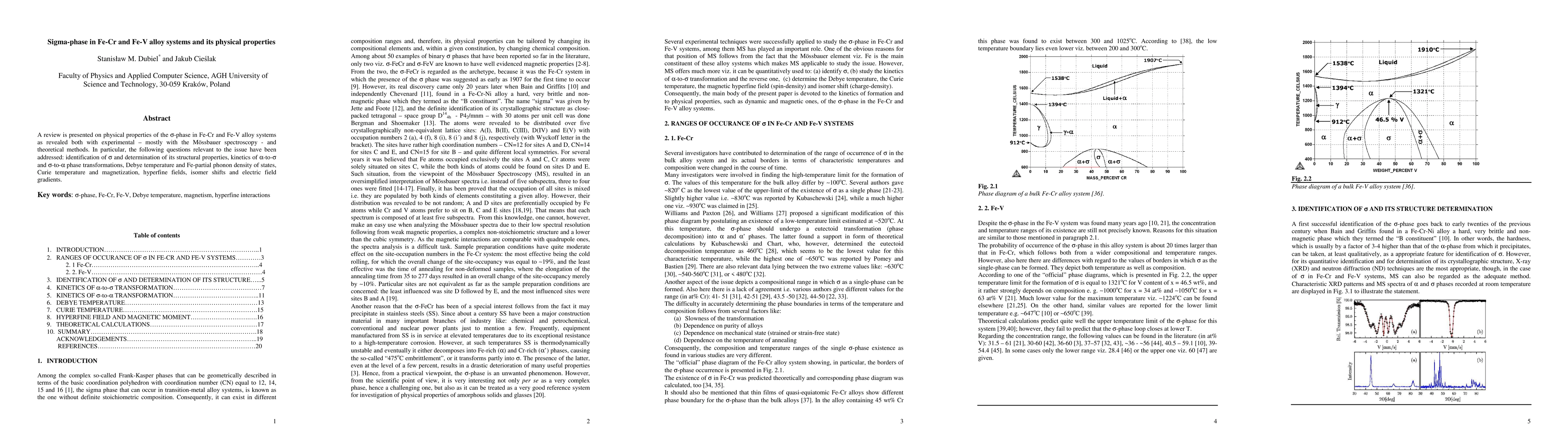 This paper reviews the physical properties of the sigma-phase in Fe-Cr and Fe-V alloy systems, utilizing experimental methods like Mössbauer spectroscopy and theoretical approaches to explore structural, kinetic, and magnetic characteristics, including phase transformations, phonon density of states, and hyperfine fields.