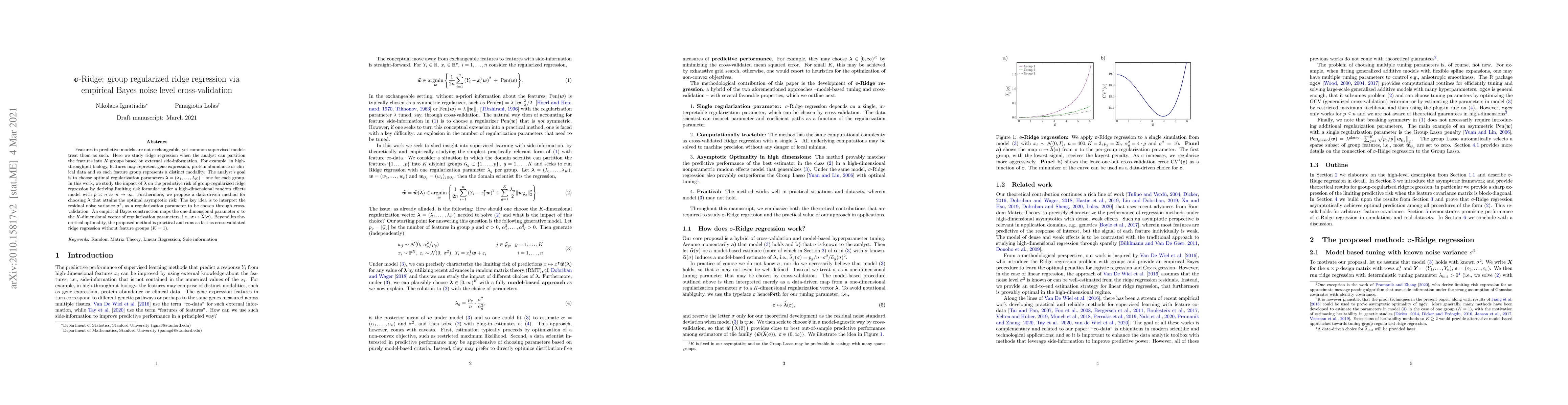 This paper proposes a group regularized ridge regression method, $\sigma$-Ridge, which uses empirical Bayes to partition features into groups based on external information and selects optimal regularization parameters through noise level cross-validation. The method achieves optimal asymptotic risk and is practical, running as fast as standard ridge regression.