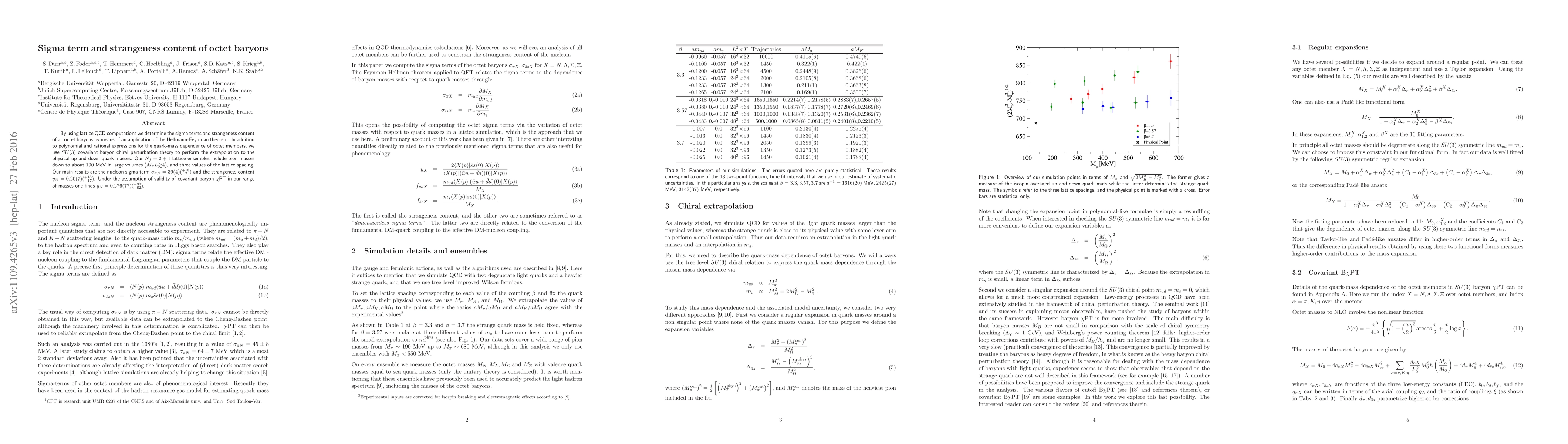 This paper uses lattice QCD computations to determine the sigma terms and strangeness content of octet baryons, applying the Hellmann-Feynman theorem and SU(3) covariant baryon chiral perturbation theory. The nucleon sigma term is found to be \sigma_{\pi N} = 39(4)(^{+18}_{-7}), and the strangeness content y_{N} = 0.20(7)(^{+13}_{-17}).