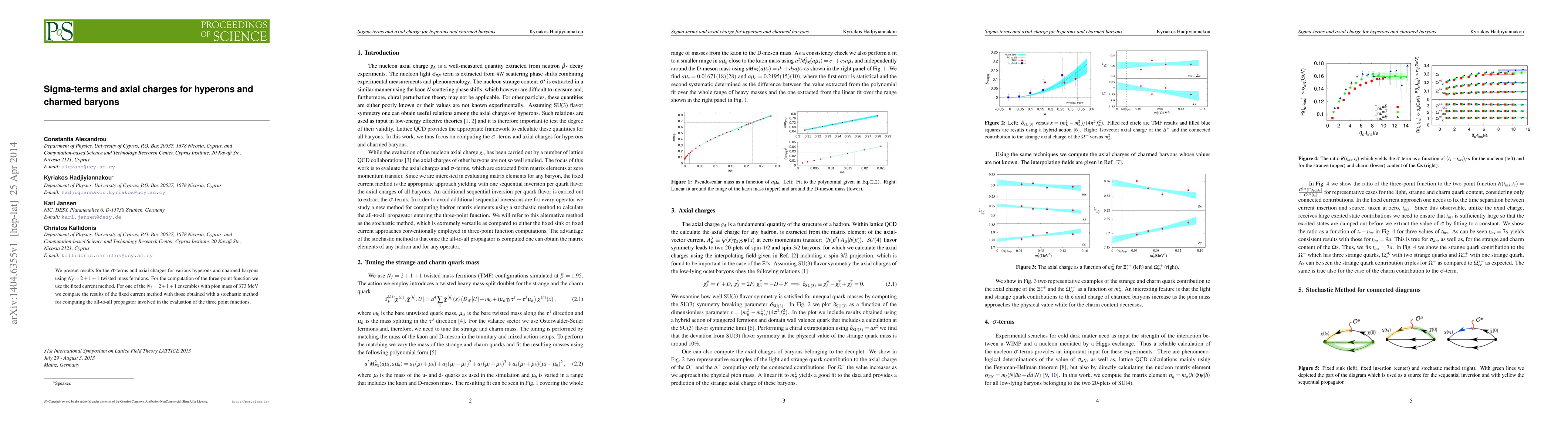 We present results for the $\sigma$-terms and axial charges for various hyperons and charmed baryons using $N_f=2+1+1$ twisted mass fermions. For the computation of the three-point function we use the fixed current method. For one of the $N_f=2+1+1$ ensembles with pion mass of 373 MeV we compare the results of the fixed current method with those obtained with a stochastic method for computing the all-to-all propagator involved in the evaluation of the three point functions.