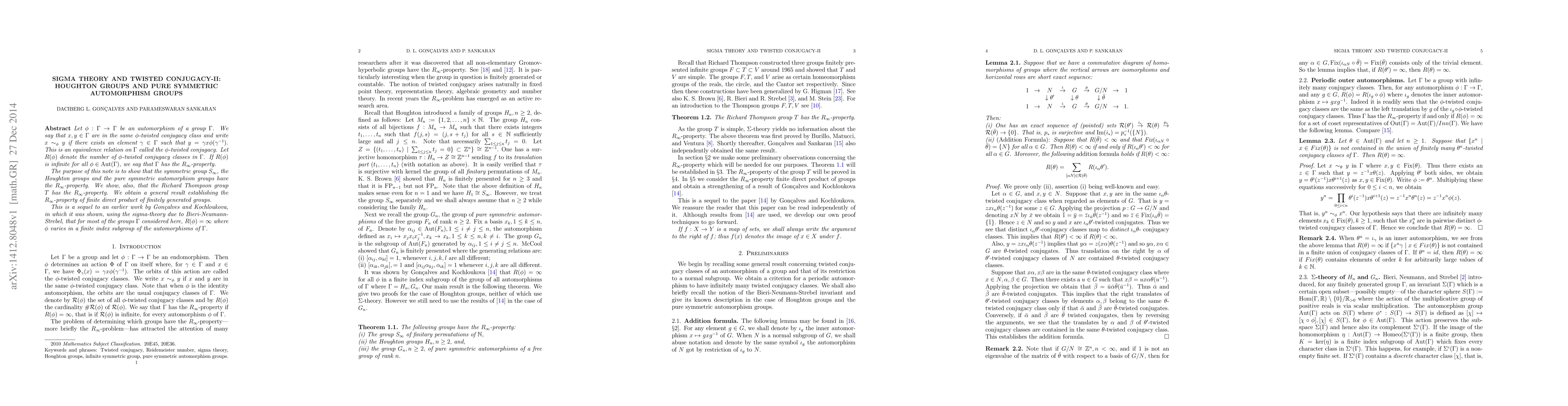 We say that $x,y\in \Gamma$ are in the same $\phi$-twisted conjugacy class and write $x\sim_\phi y$ if there exists an element $\gamma\in \Gamma$ such that $y=\gamma x\phi(\gamma^{-1})$. This is an equivalence relation on $\Gamma$ called the $\phi$-twisted conjugacy. Let $R(\phi)$ denote the number of $\phi$-twisted conjugacy classes in $\Gamma$. If $R(\phi)$ is infinite for all $\phi\in Aut(\Gamma)$, we say that $\Gamma$ has the $R_\infty$-property. The purpose of this note is to show that the symmetric group $S_\infty$, the Houghton groups and the pure symmetric automorphism groups have the $R_\infty$-property. We show, also, that the Richard Thompson group $T$ has the $R_\infty$-property. We obtain a general result establishing the $R_\infty$-property of finite direct product of finitely generated groups.