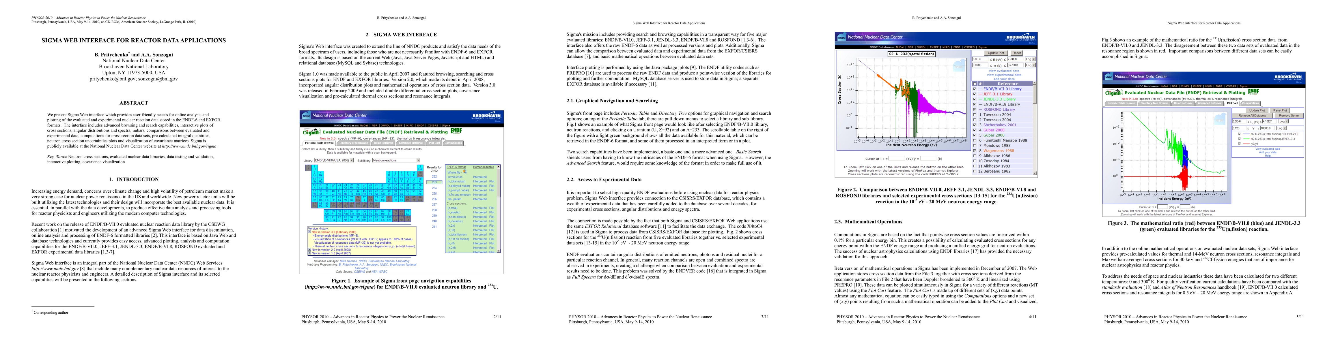 The Sigma Web interface provides user-friendly access to online analysis and plotting of evaluated and experimental nuclear reaction data stored in ENDF-6 and EXFOR formats. It includes advanced browsing, search capabilities, and interactive plots for cross sections, angular distributions, spectra, nubars, and comparisons between evaluated and experimental data.