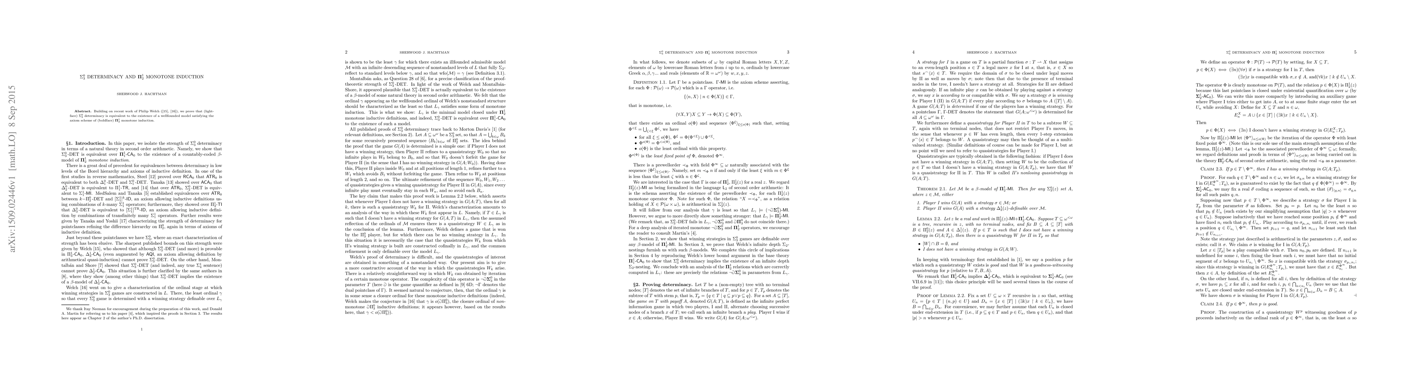 This paper establishes the equivalence between lightface $\Sigma^0_3$ determinacy and the existence of a wellfounded model that satisfies the axiom scheme of boldface $\mathbf{\Pi}^1_2$ monotone induction, building on Philip Welch's recent contributions.